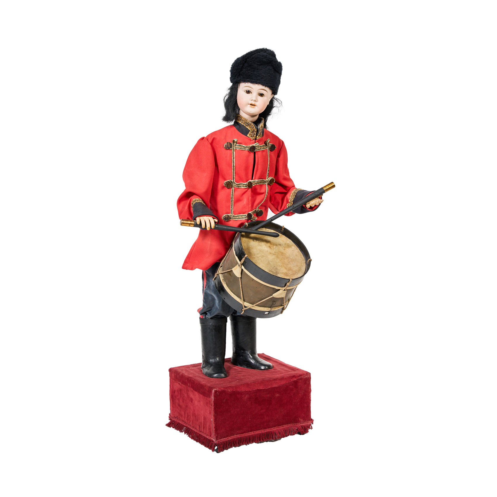 Autómata de Tamborilera en porcelana y madera policromada con cabeza en biscuit, pelo natural y ojos en cristal, fles. del s.XIX-ppios. del s.XX. Marcas en la nuca G=K 44_31. Siguiendo modelos de Leopold Lambert (Jouques, Francia, 1886-1914) y Tête Jumeau (Montreuil-sous-Bois, Francia, 1843-1899). Custodiada por vitrina expositora en madera lacada en negro y cristal en la parte frontal.