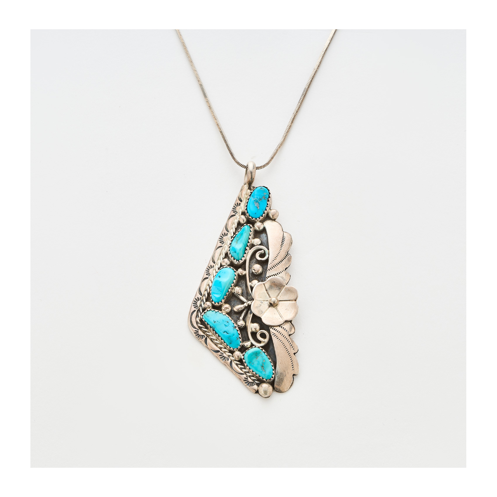 Colgante en plata con motivos florales y cuentas de turquesa de 11 y 13 mm.