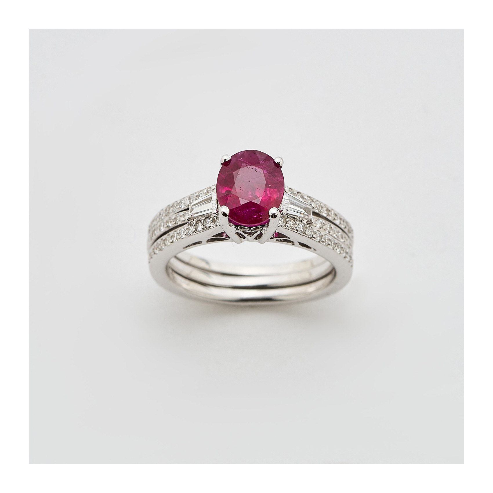 Dos sortijas adaptables en oro blanco, una con rubí de Burma talla oval y otra diseño media alianza, ambas con diamantes talla brillante.