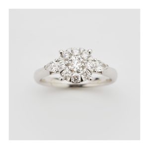 Sortija en oro blanco con rosetón central de diamantes talla marquise y pavé de diamantes tallas brillante y 8/8.