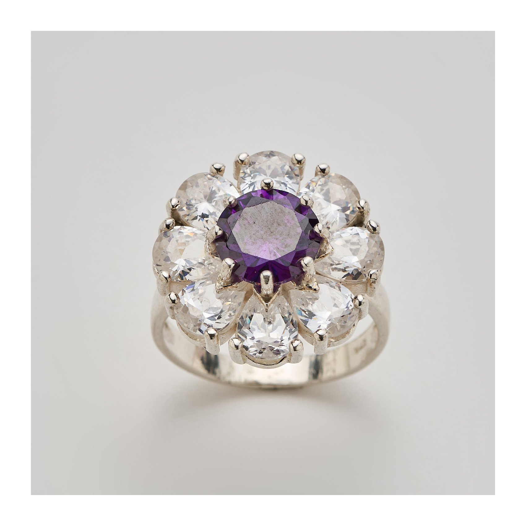 Sortija rosetón en plata con amatista talla redonda de 8 mm. y circonitas talla redonda.