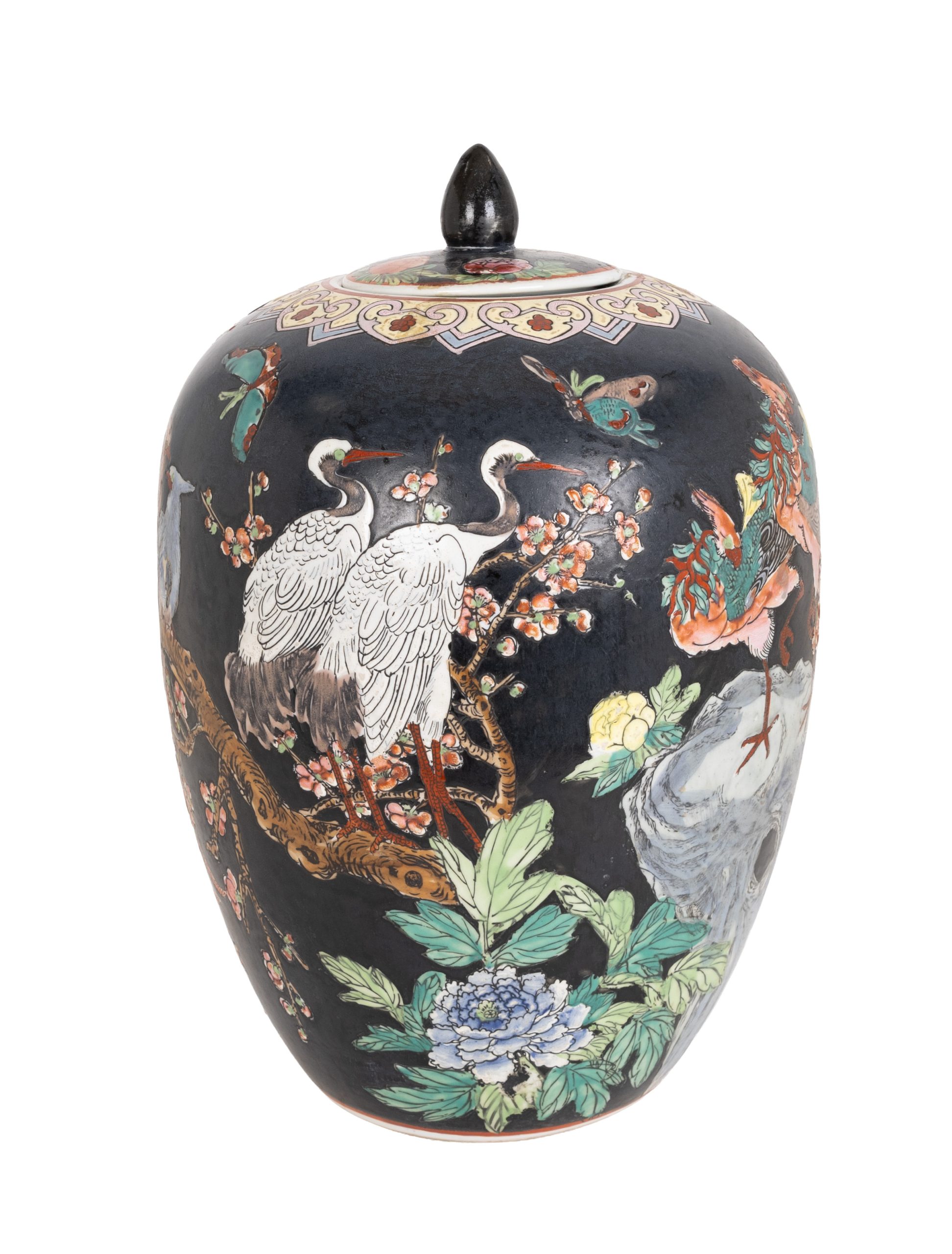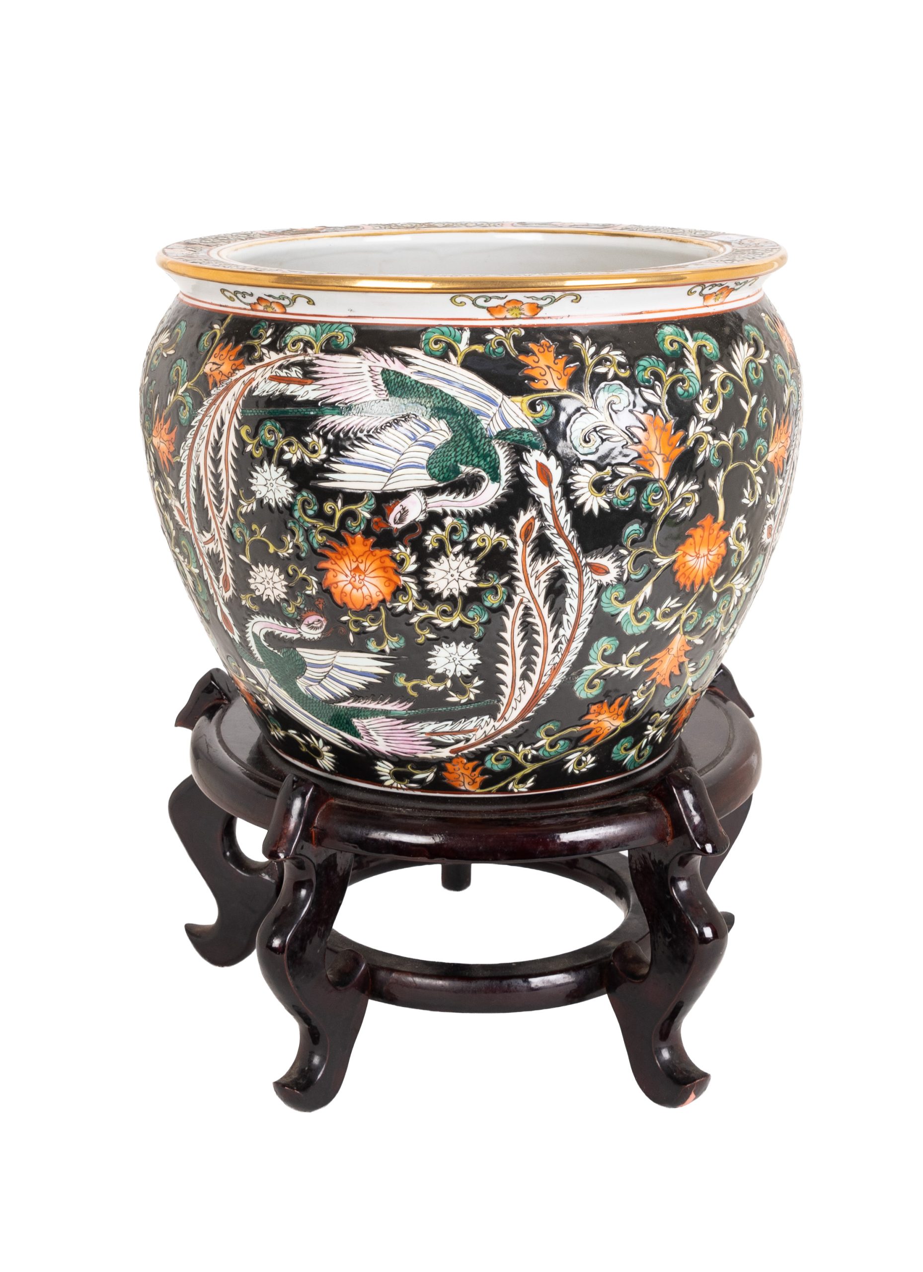 Tibor y macetero en porcelana china Familia Negra con decoraciones esmaltadas de motivos florales y de aves fénix, s.XX. El macetero apoya sobre peana en madera frutal tallada.