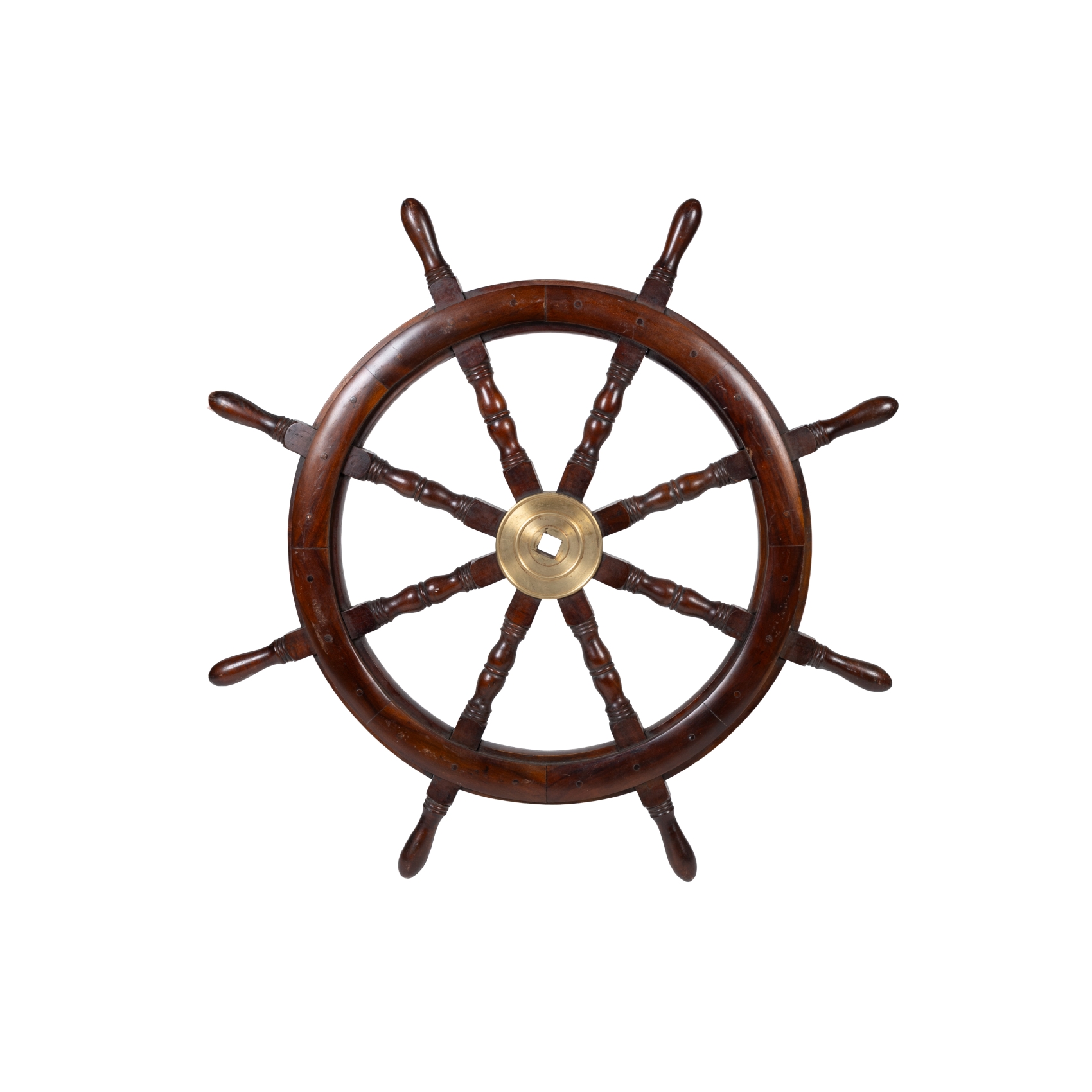 Timón de barco en madera de teca torneada y centro en bronce dorado, s.XX.