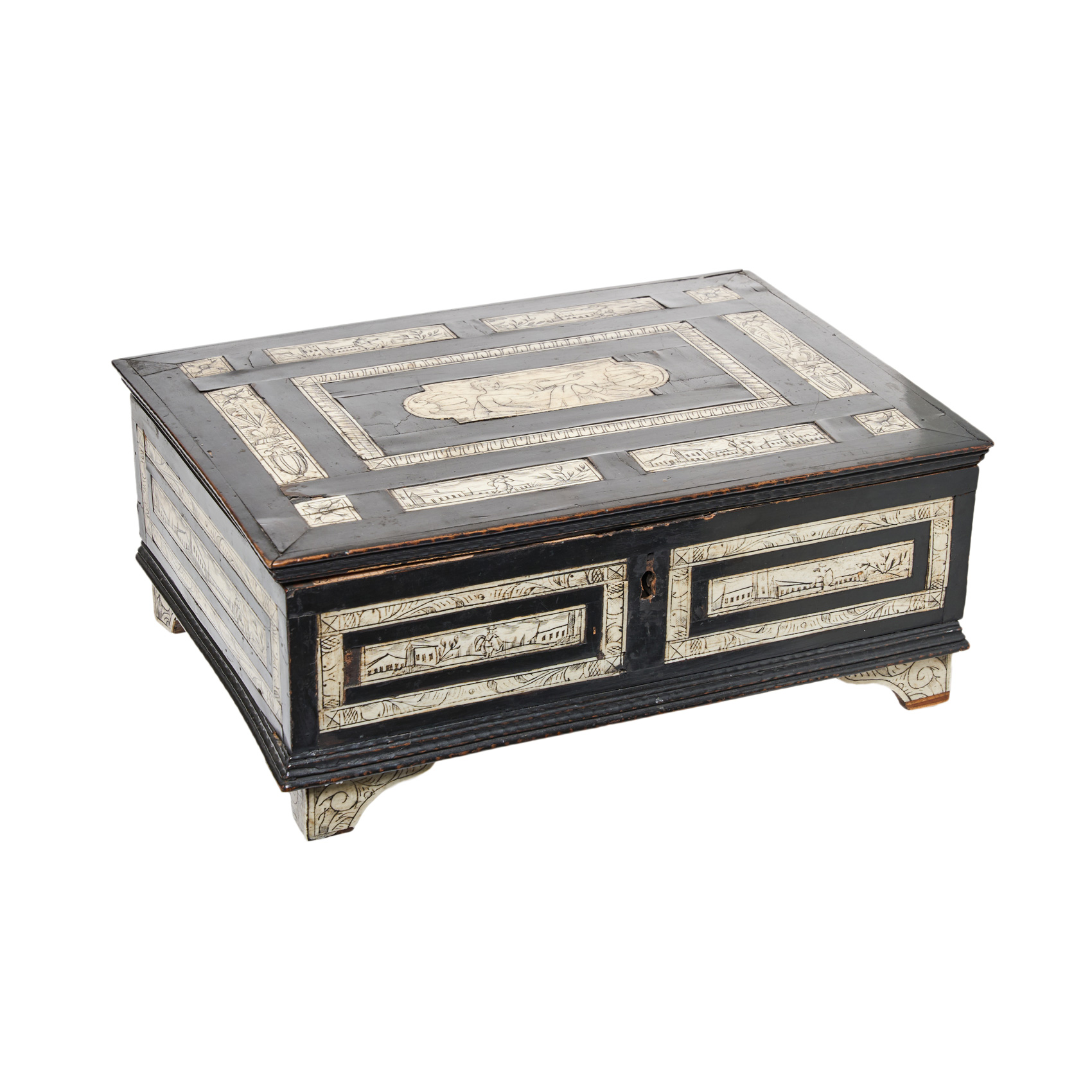 Pequeña arqueta italo-flamenca chapada en madera ebonizada y placas en hueso grabado, s.XVII. Decorada por motivos florales y paisaje. Placa central con representación de la diosa Venus. Presenta cajón en el lateral derecho. Interior decorado por papel de época posterior. Adjunta llave.