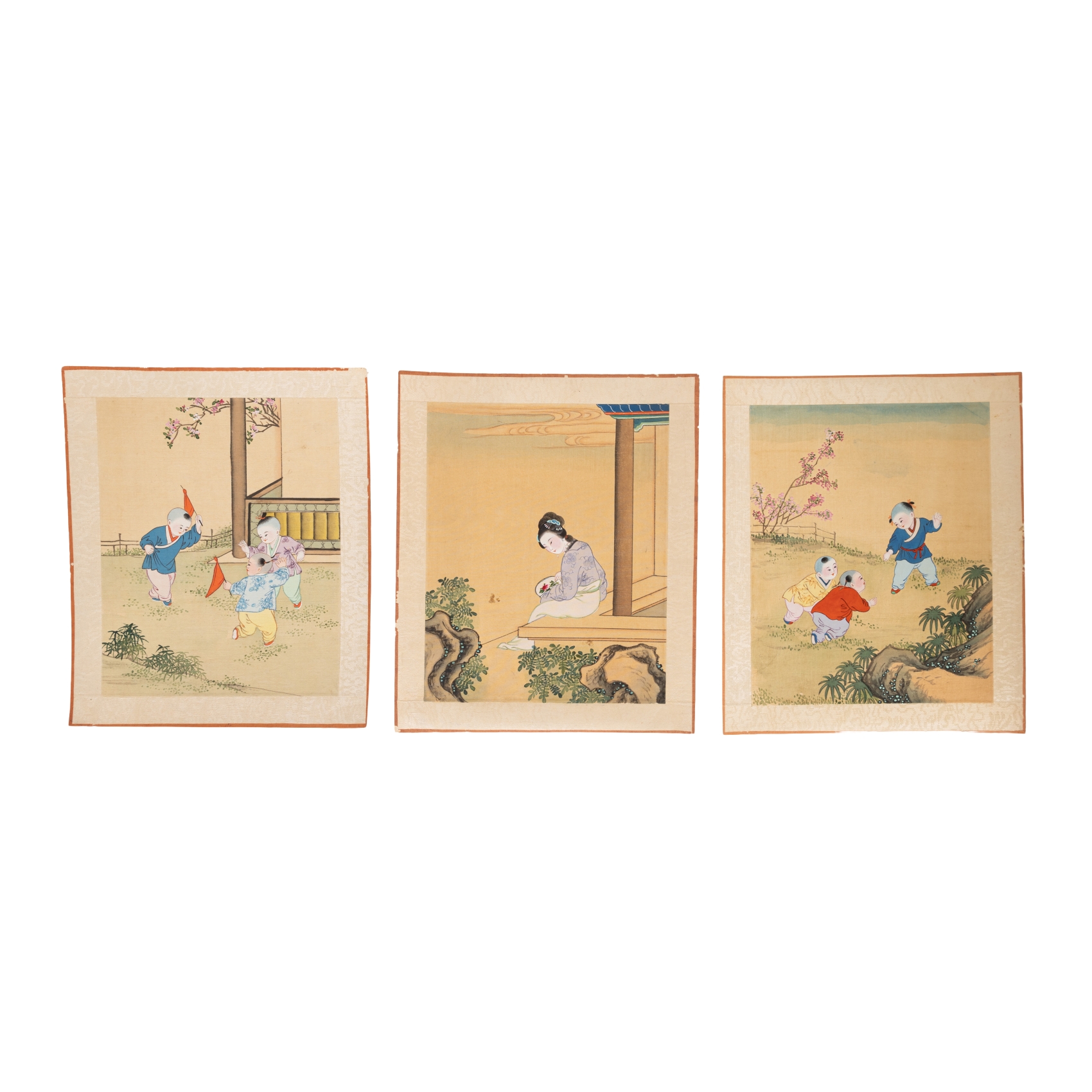 Lote de tres dibujos chinos pintados sobre seda con representación de infantes jugando y personaje femenino, s.XX. Sin enmarcar.