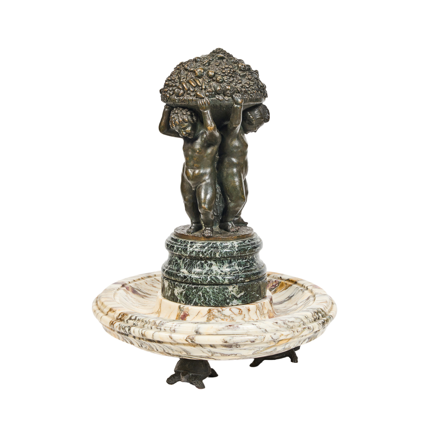 Escultura en bronce patinado sobre peanas y jardinera en mármoles contrastados sustentados por tortugas en bronce. Firmada.