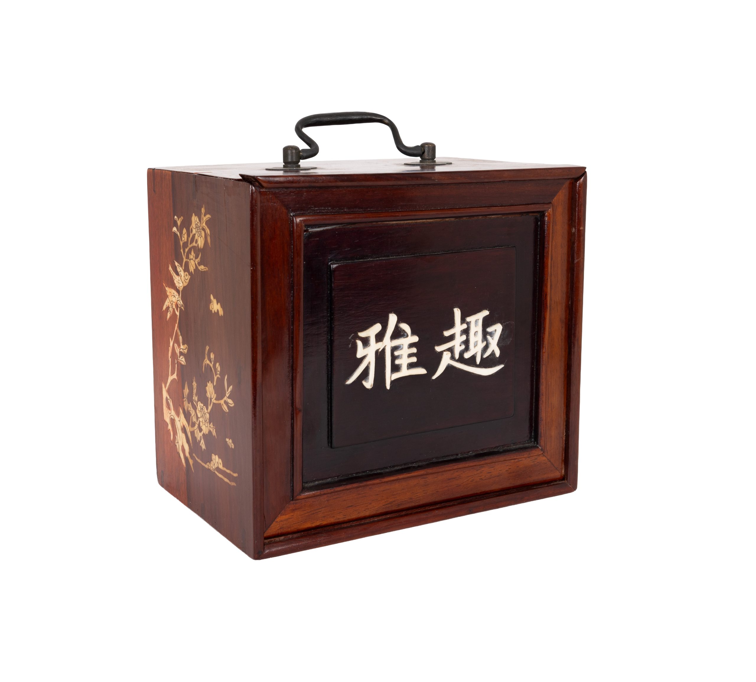 Mahjong chino, ppios. del s.XX. Juego completo con fichas en hueso y bambú. Caja en madera frutal compartimentada en cinco cajones.