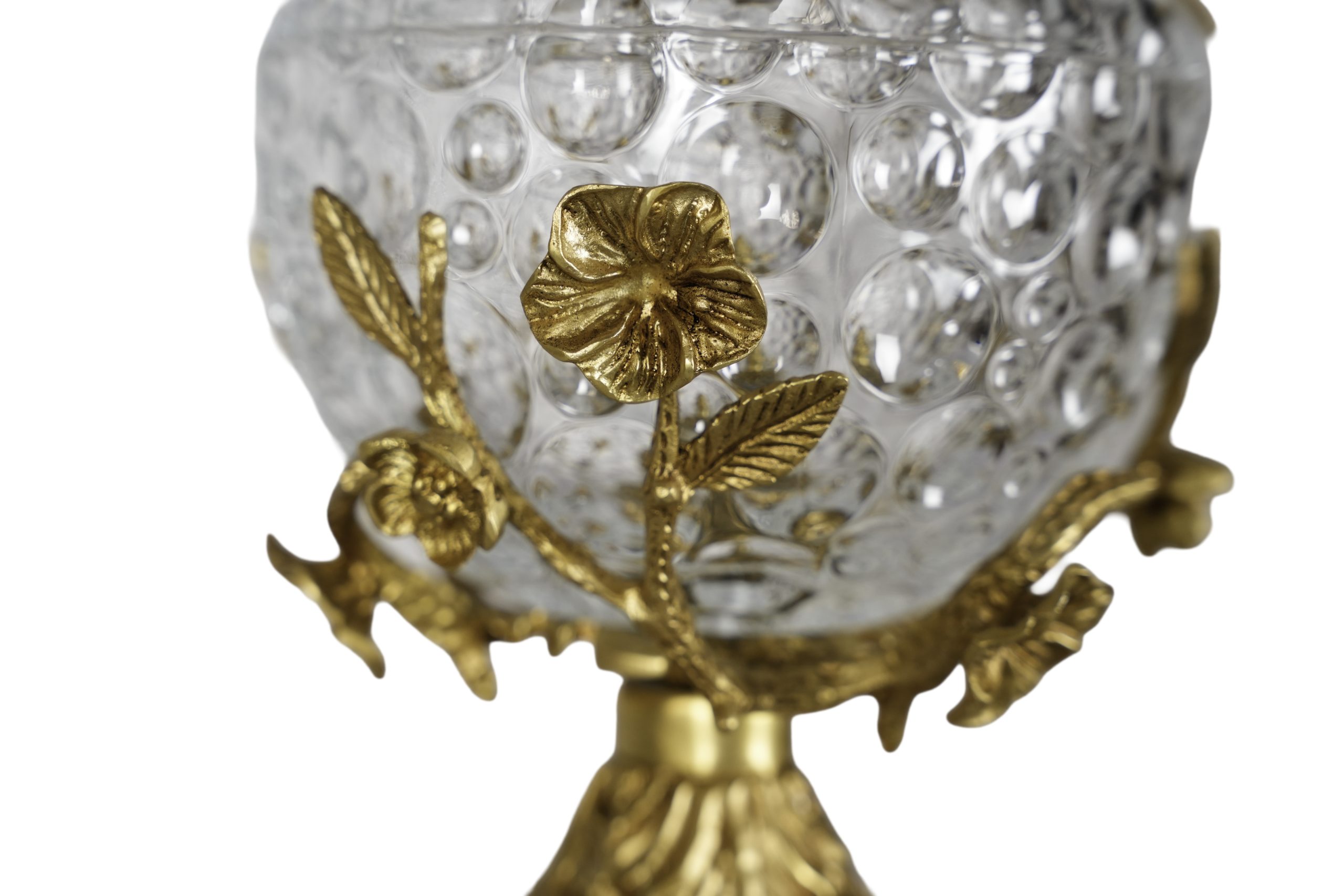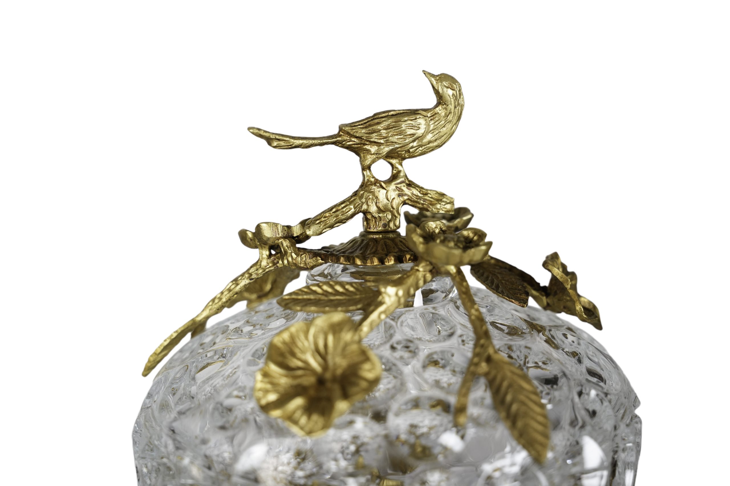 Bombonera francesa en cristal con montura en bronce dorado rematada por ave, s.XX.