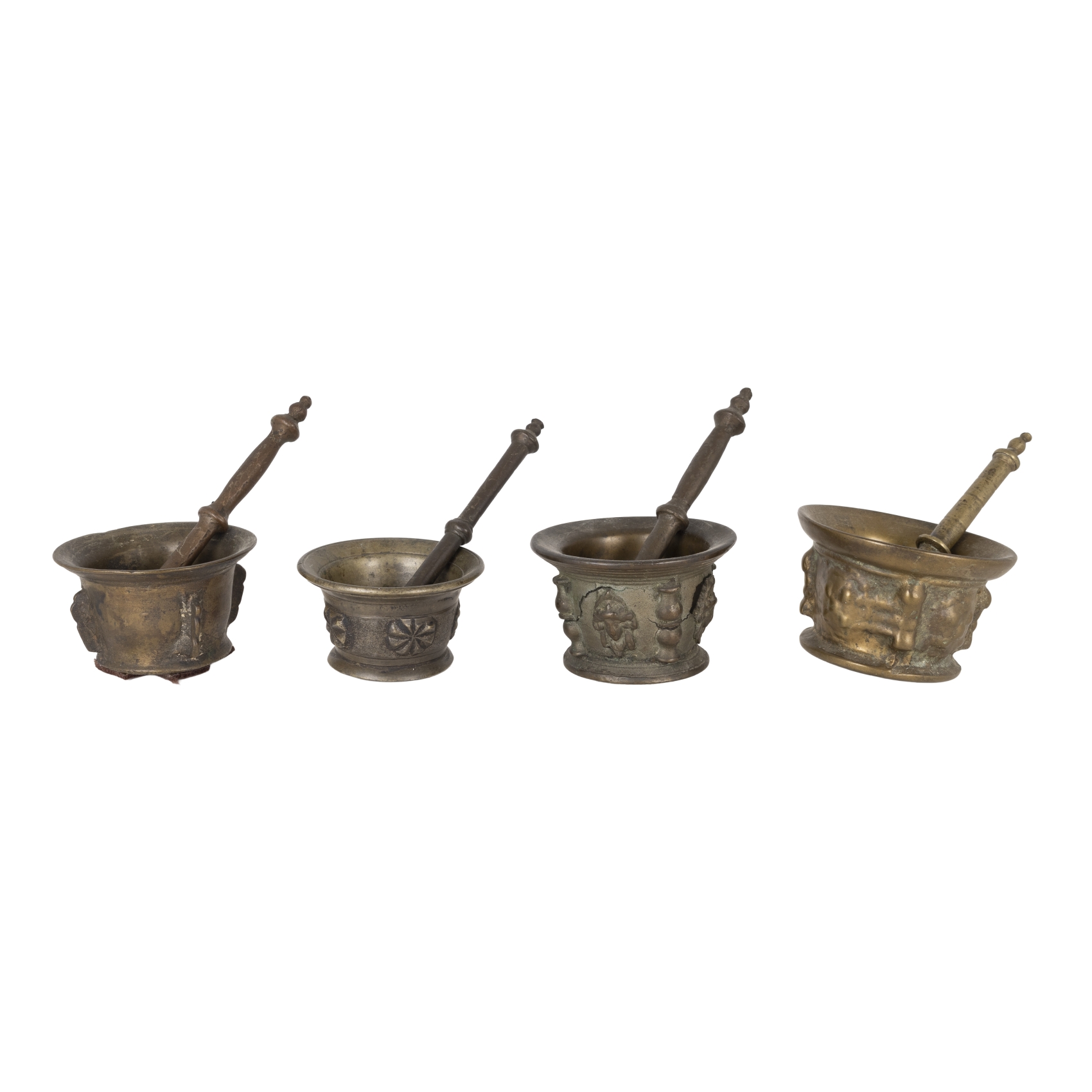 Lote de cuatro morteros de farmacia con sus manos en bronce, fles. del s.XIX-ppios. del s.XX.