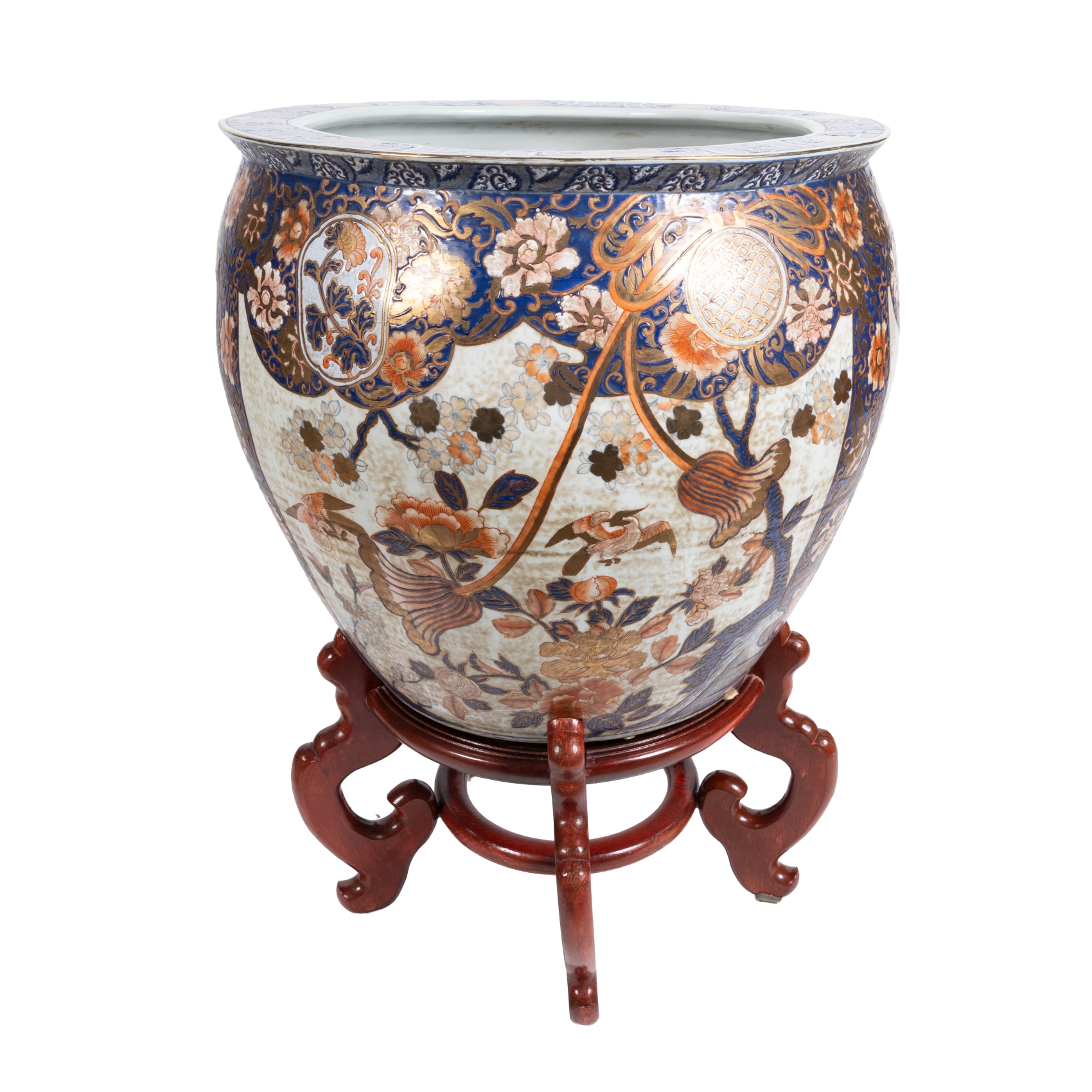 Gran jardinera oriental en porcelana china con decoraciones florales y de aves en cartelas, s.XX Interior esmaltado con decoración de pecera. Apoya sobre peana en madera frutal tallada. Marcas en la base.