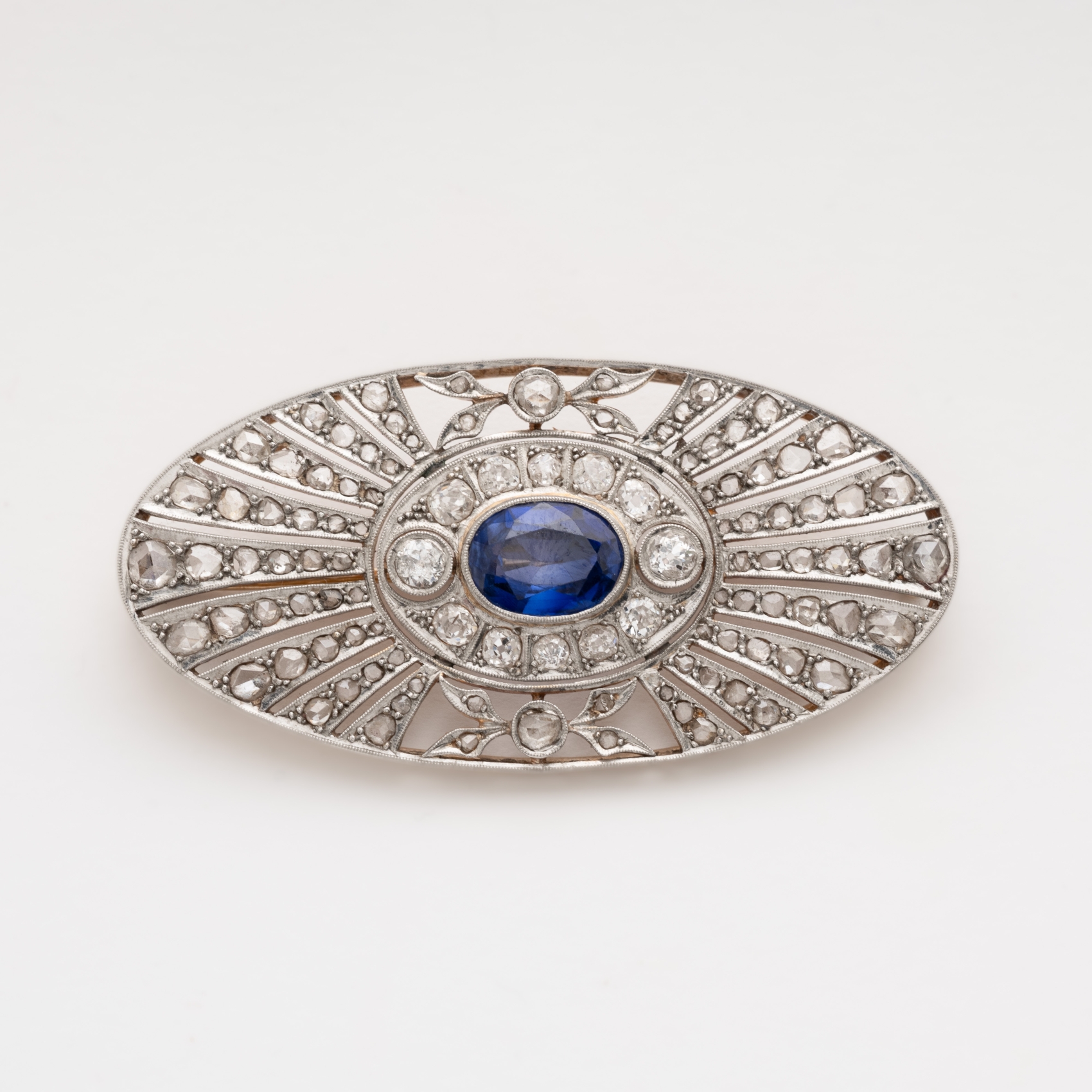 Broche Art Deco diseño oval, c.1930, en oro y vistas en platino con símil de zafiro azul talla oval de 10 x 7 mm orlado por diamantes talla brillante antigua y calado de diamantes talla rosa, 5,5 x 2,9 cm.