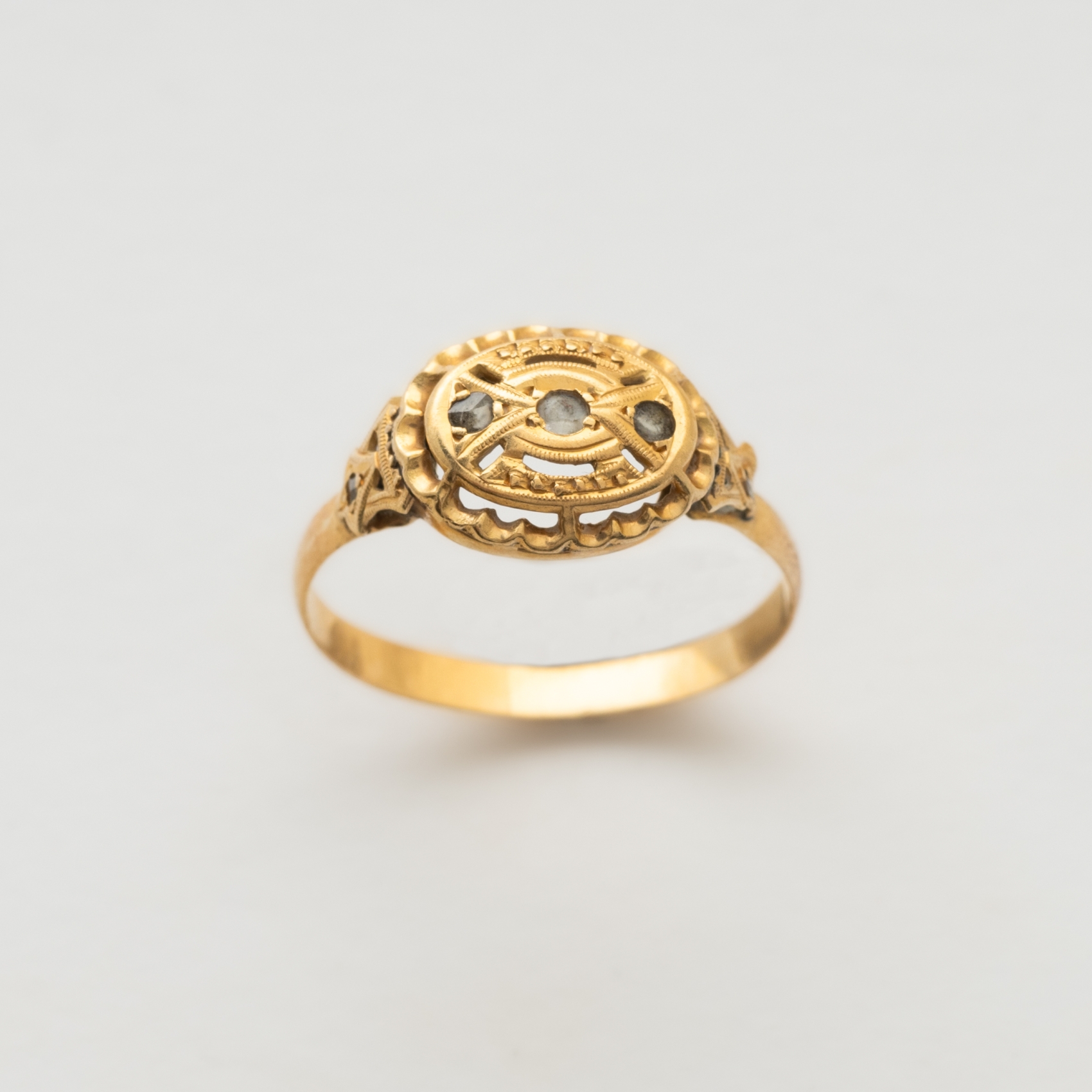 Sortija en oro y vistas en platino con diamantes talla 8/8 y perlas de aljofar, segundo cuarto del s.XX.