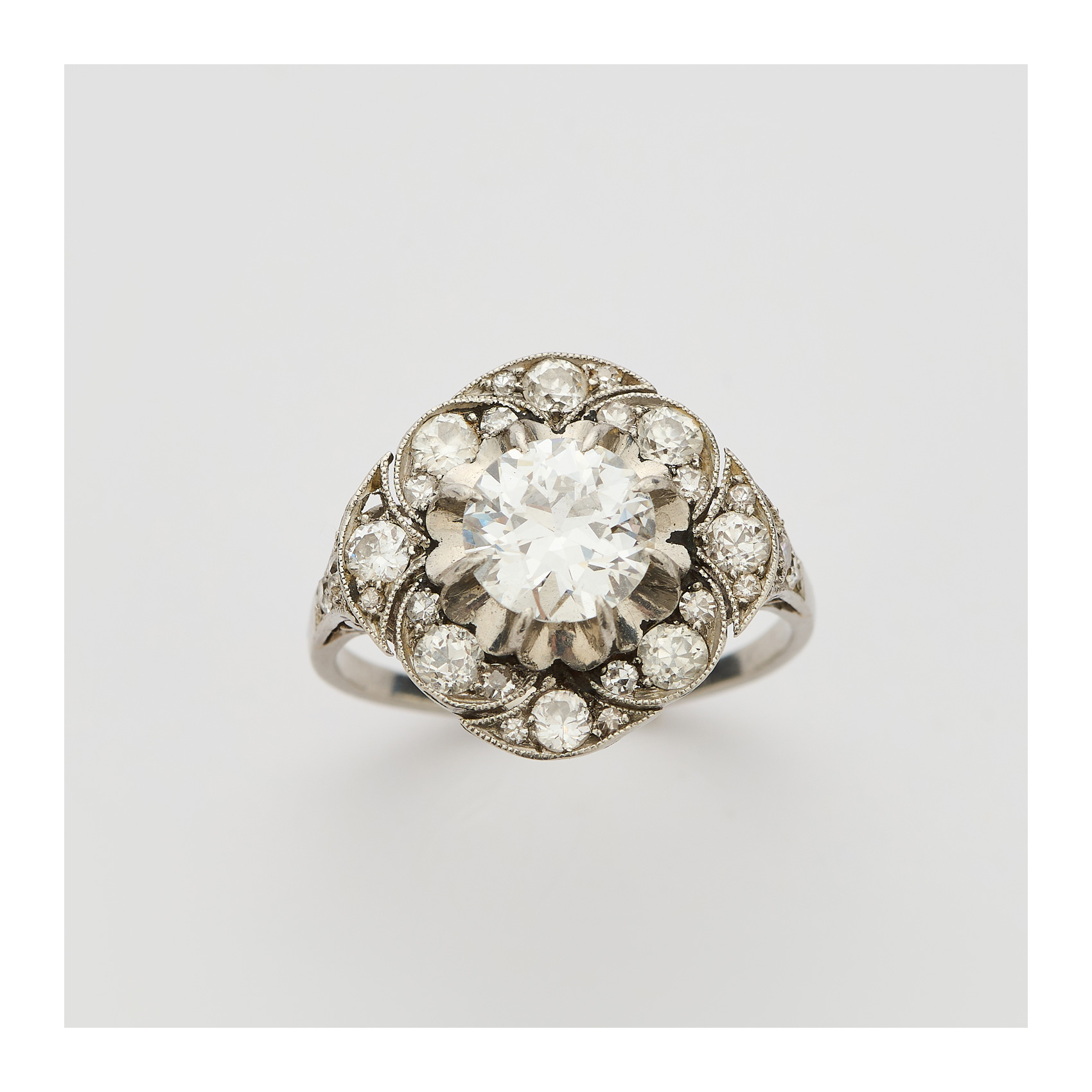 Sortija en platino con centro y orla calada de diamantes talla brillante antigua, c.1930.