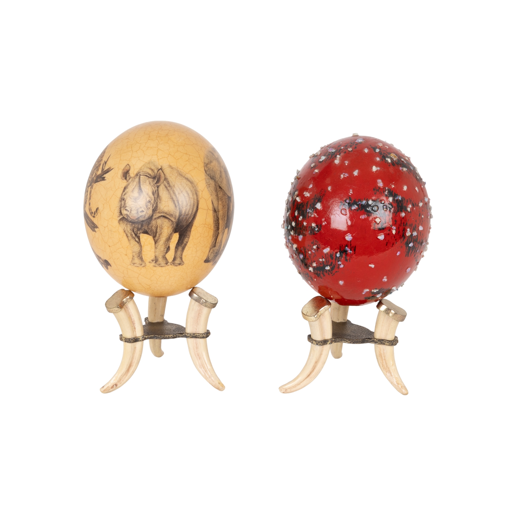 Pareja de huevos de avestruz sobre soporte de colmillos y montura en metal dorado, s.XX. Uno esmaltado en rojo con aplicaciones de pedrería. Otro estampado con representación de animales de la sabana.