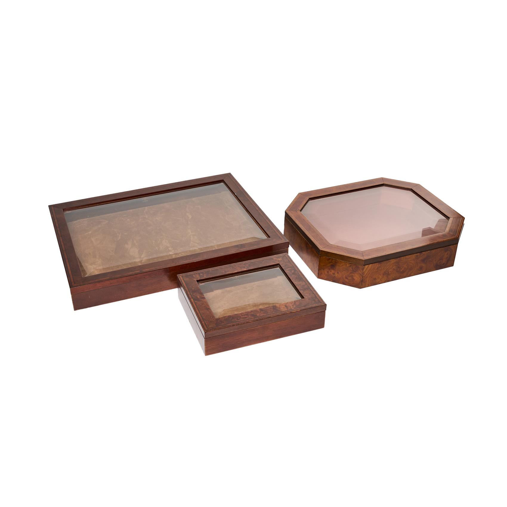 Lote de tres cajas expositoras de diferentes tamaños en madera chapada con decoración de marqueterias, s.XX. Presentan tapa en cristal biselado. Dos de ellas con etiqueta de origen.
