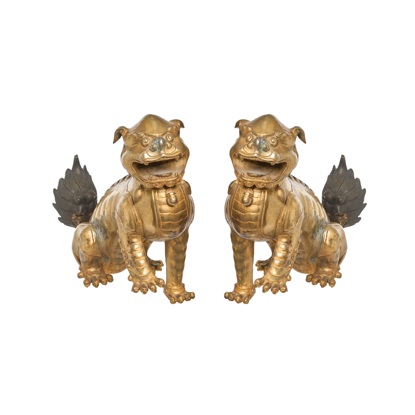 Pareja de Fúrias orientales en metal dorado y patinado, c.1930-1940.