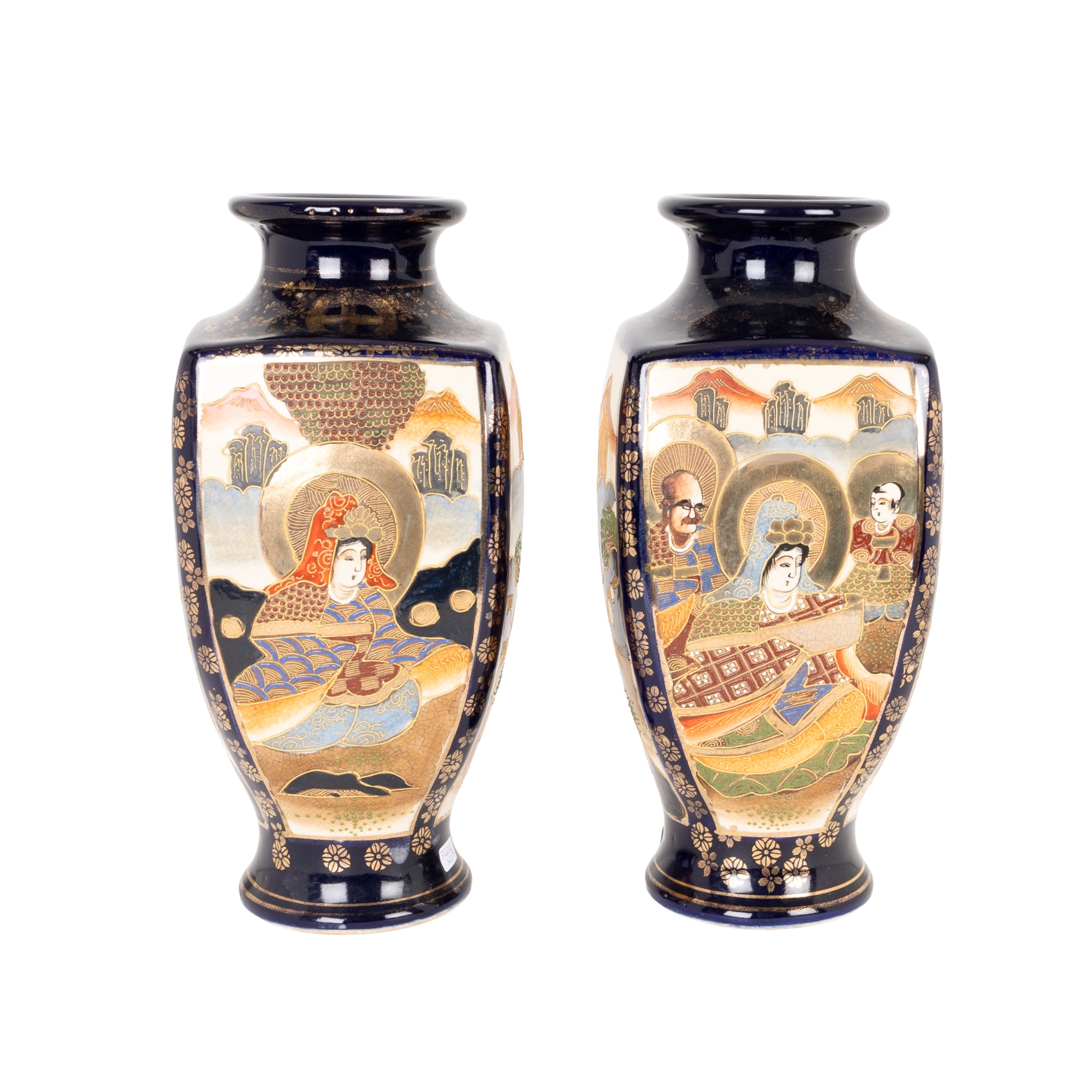 Pareja de jarrones en porcelana japonesa de Satsuma con decoraciones paisajísticas y de personajes en cartelas, segunda mitad del s.XX. Marcas en la base.