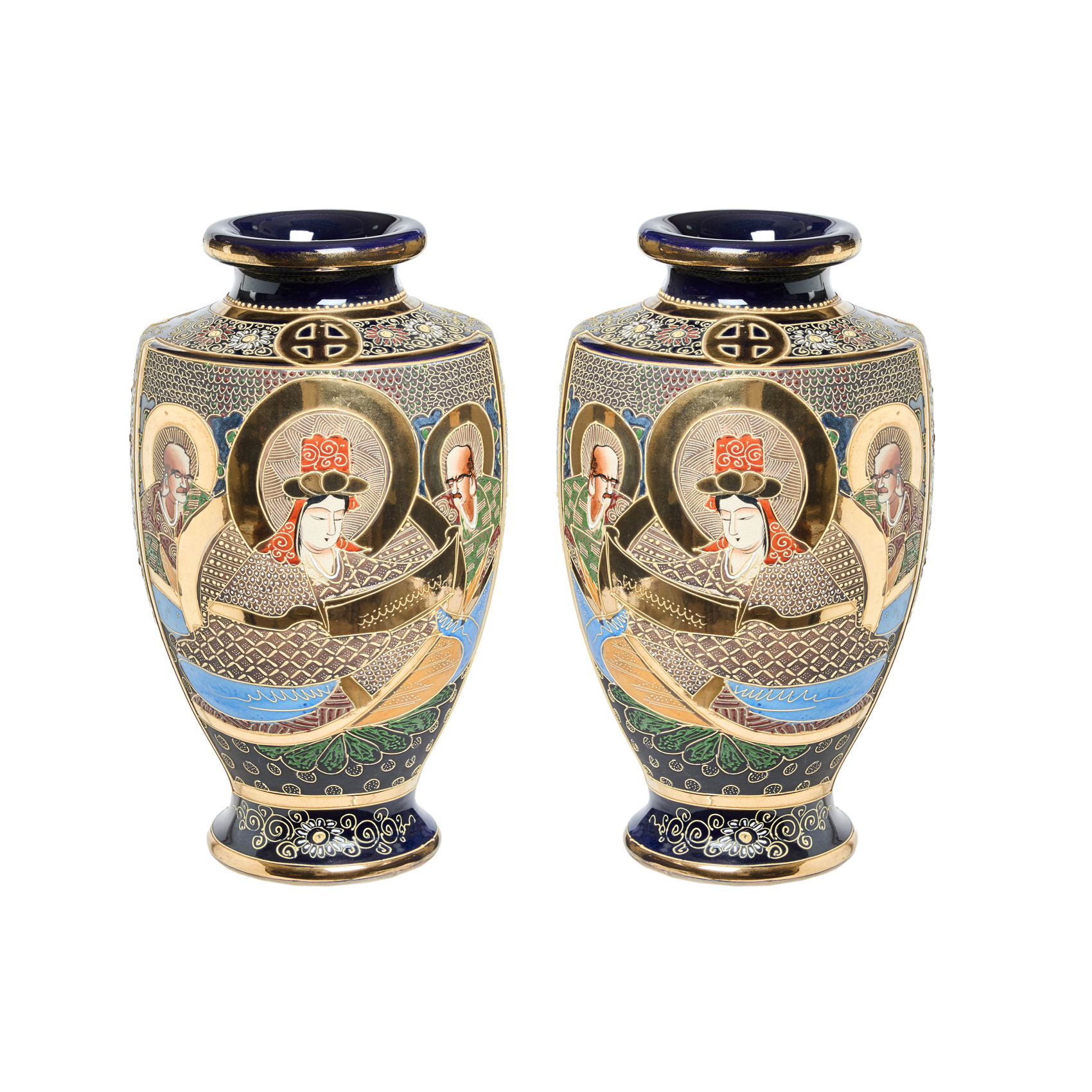 Pareja de jarrones en cerámica japonesa de Satsuma con decoraciones florales y de personajes sobre fondo en azul cobalto, s.XX.