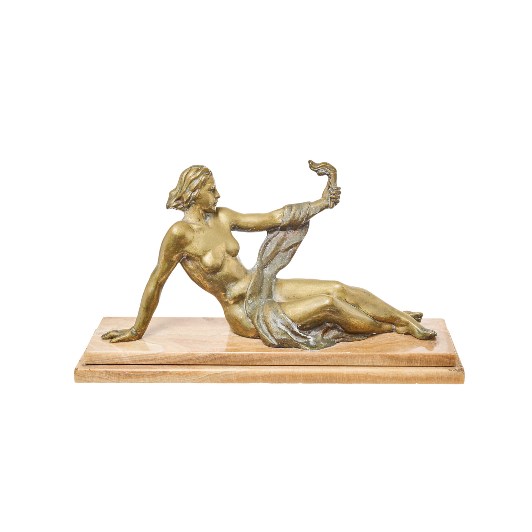 Escultura Art Deco en bronce dorado sobre peana en ónix rosa.