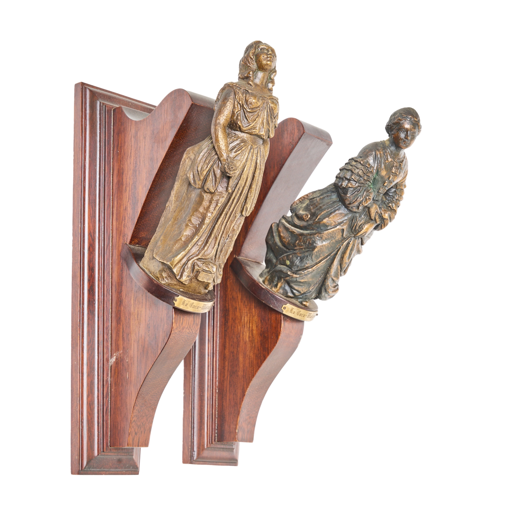 Pareja de mascarones de proa en miniatura en bronce patinado con representación de damas, s.XX. Apoyan sobre ménsulas en madera.