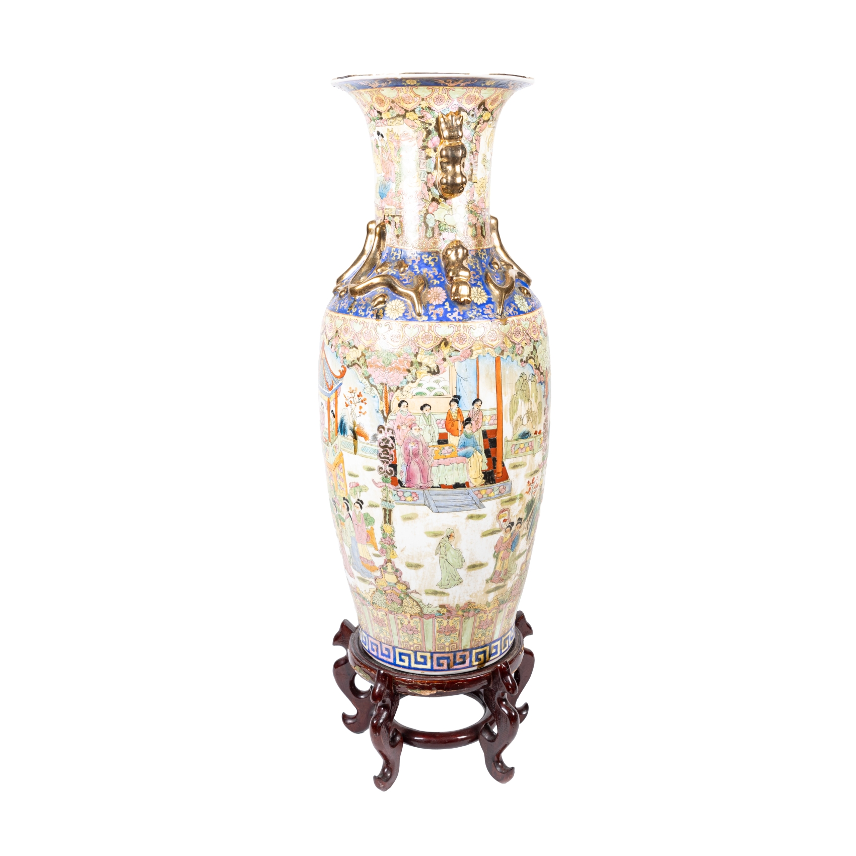 Jarrón en porcelana china Familia Verde con decoración de escenas palaciegas en cartelas, s.XX. Apoya sobre peana en madera frutal tallada.