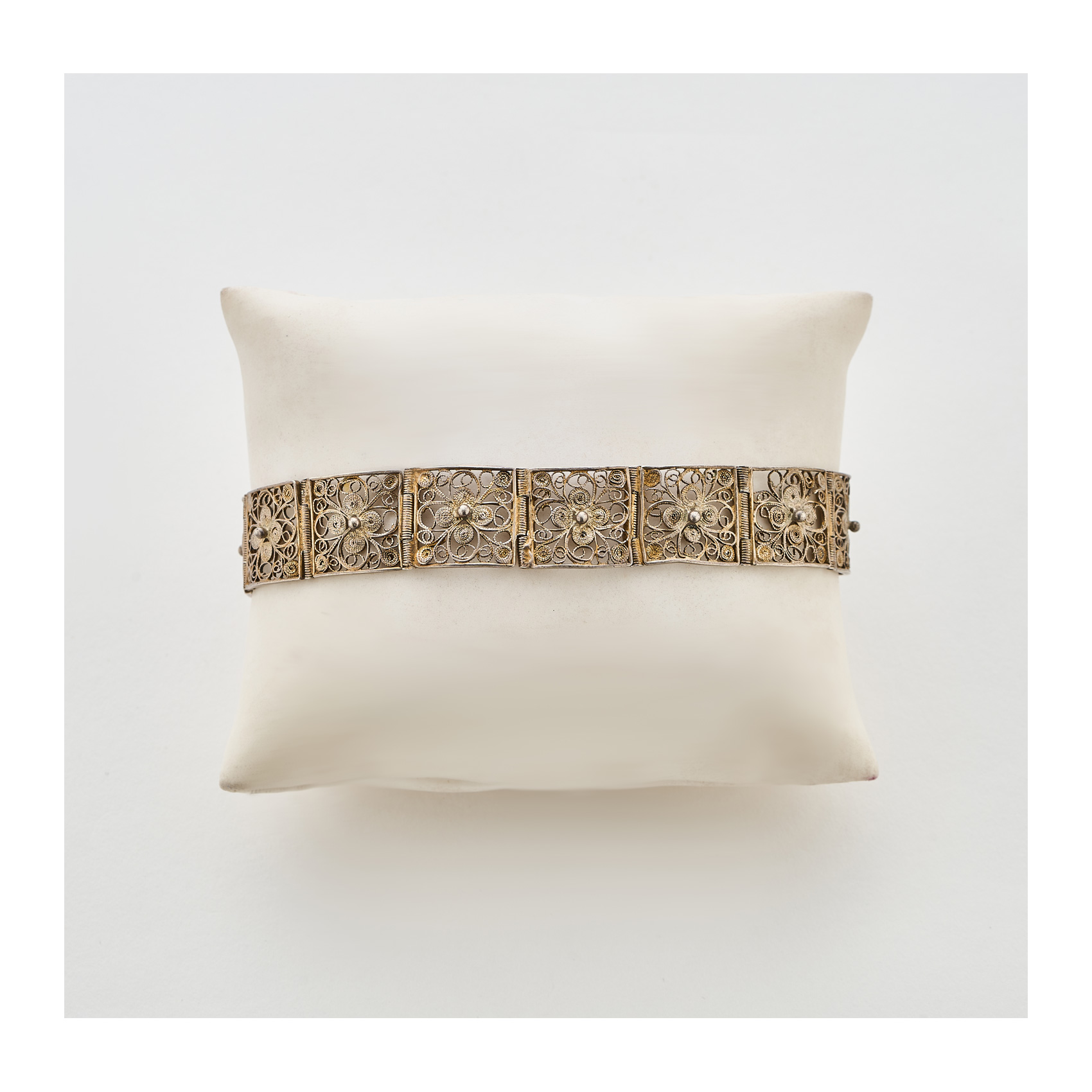 Pulsera de eslabones cuadrados con decoración floral en filigrana.