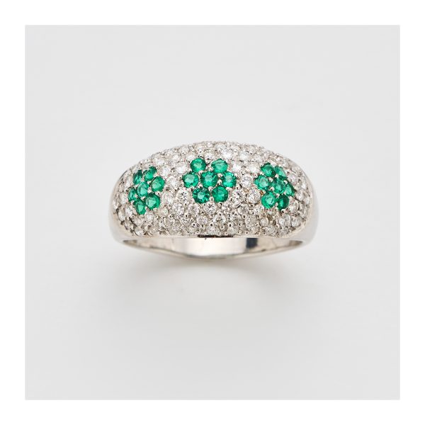 Sortija diseño bombé en oro blanco con tres rosetones de esmeraldas talla redonda y pavé de diamantes talla brillante.