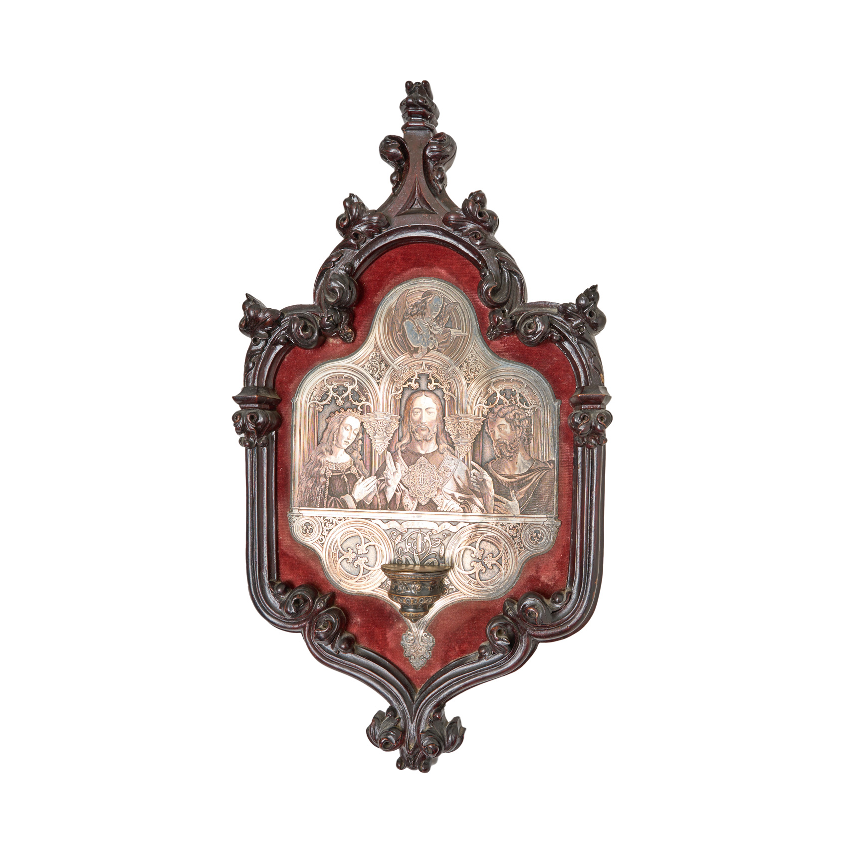 Benditera alemana en cobre repujado y patinado con representación del Sagrado Corazón, fles. del s.XIX-ppios. del s.XX. Enmarcada sobre plafón en madera tapizado en rojo.