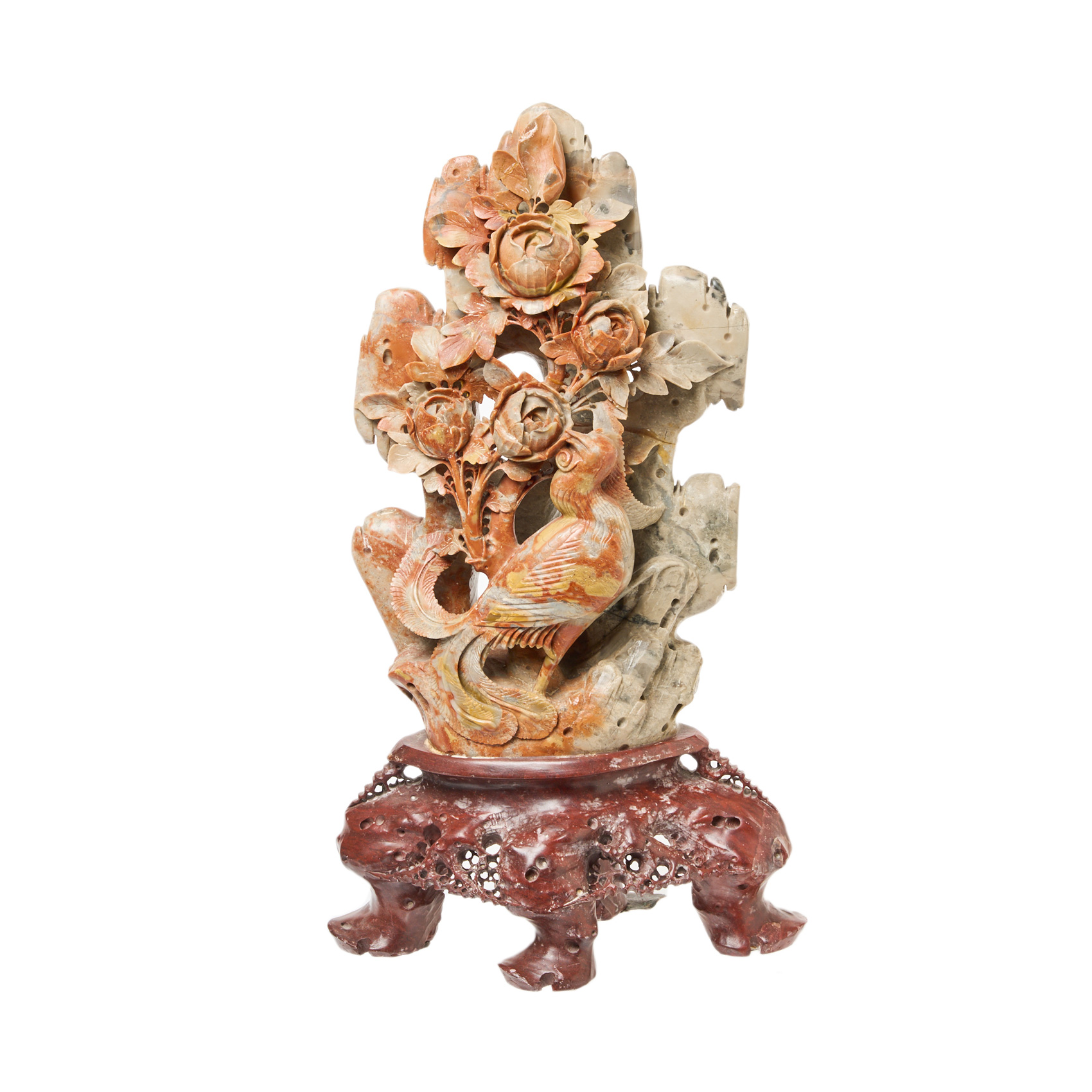 Ave con flores. Grupo escultórico chino en piedra jabón tallada, s.XX.