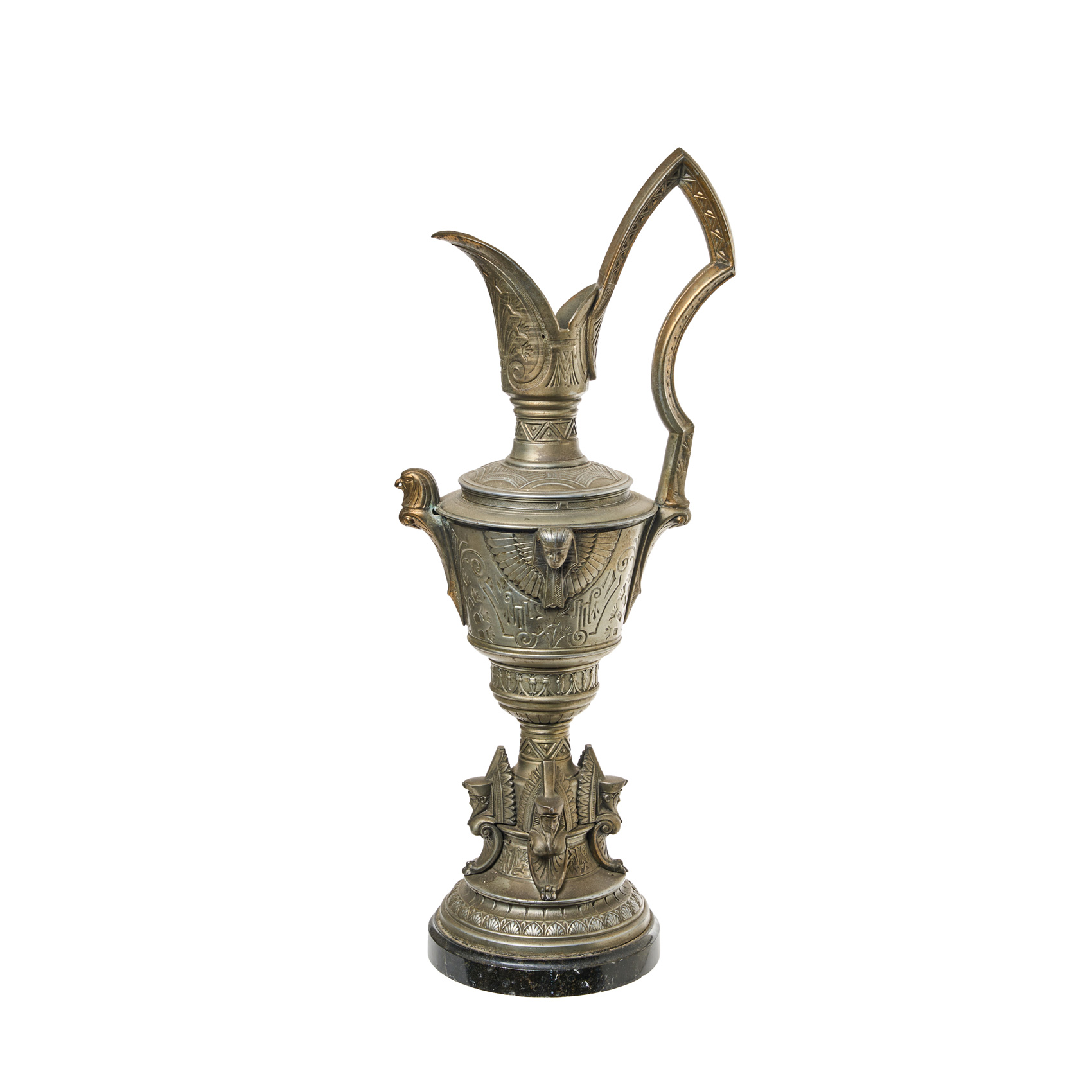 Pareja de ánforas en latón dorado con base en mármol negro. Presenta decoración de inspiración egipcia en relieve, fles. del s.XIX-ppios. del XX.