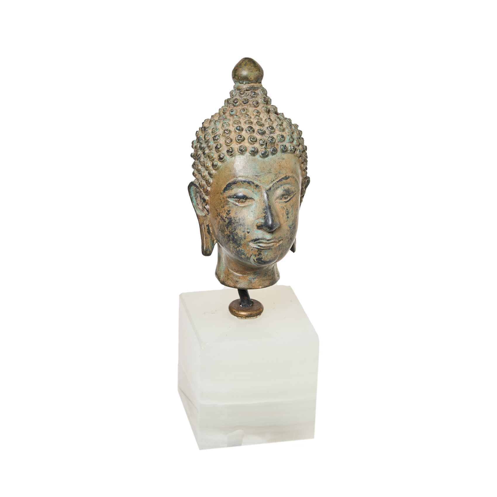Cabeza de buda en bronce patinado sobre peana en ónix blanco, ppios. del s.XX.