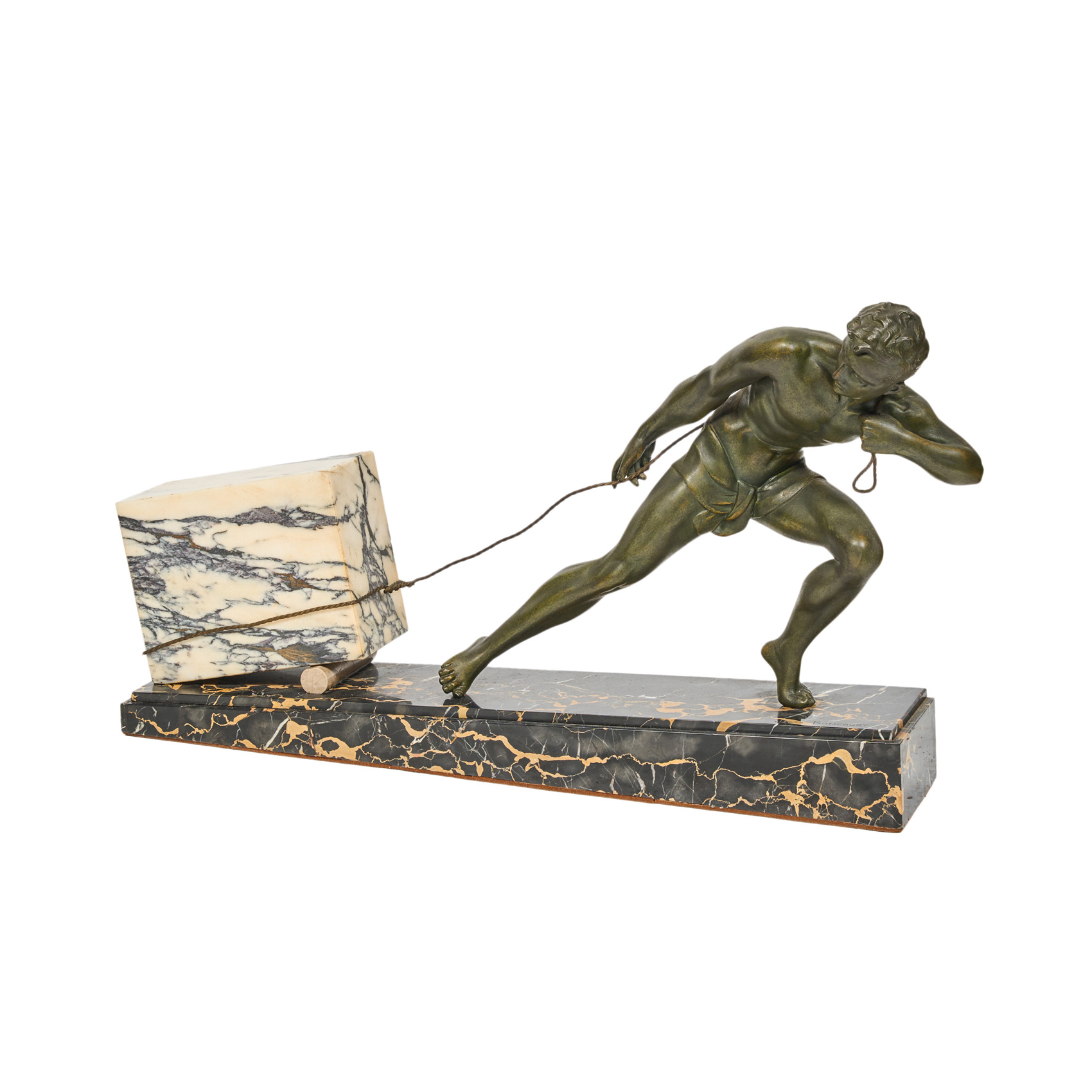 Escultura en calamina patinada y mármol blanco veteado sobre peana en mármol portoro. Firmada.
