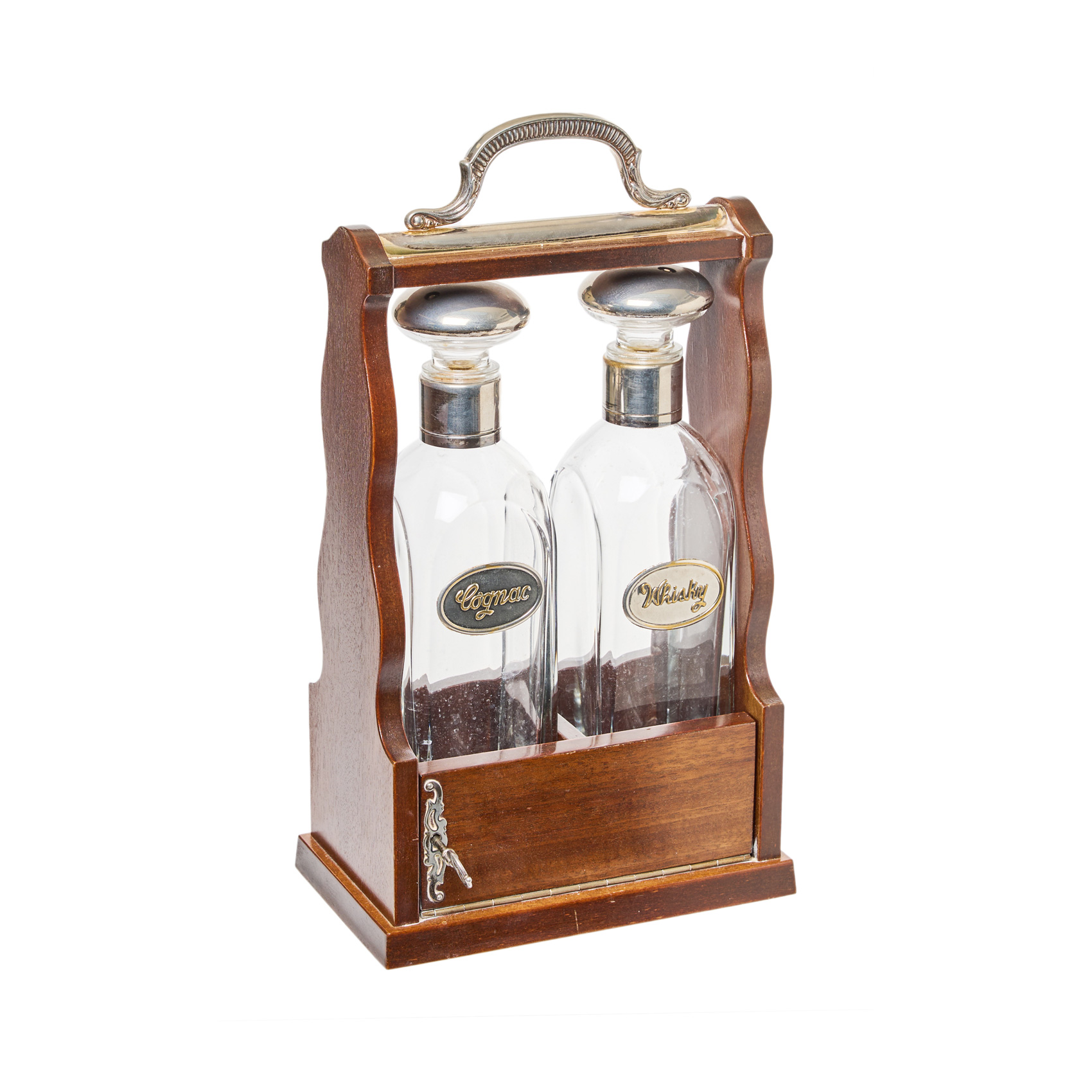 Convoy con pareja de licoreras en cristal y metal plateado para Whisky y Cognac, s.XX. Estructura en madera tallada con apertura frontal con llave.