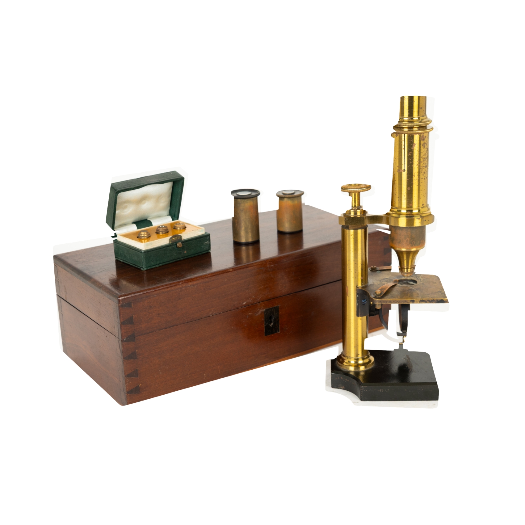 Microscopio monocular francés de viaje en latón dorado, c.1900. Se acompaña de estuche en madera con múltiples ópticas.