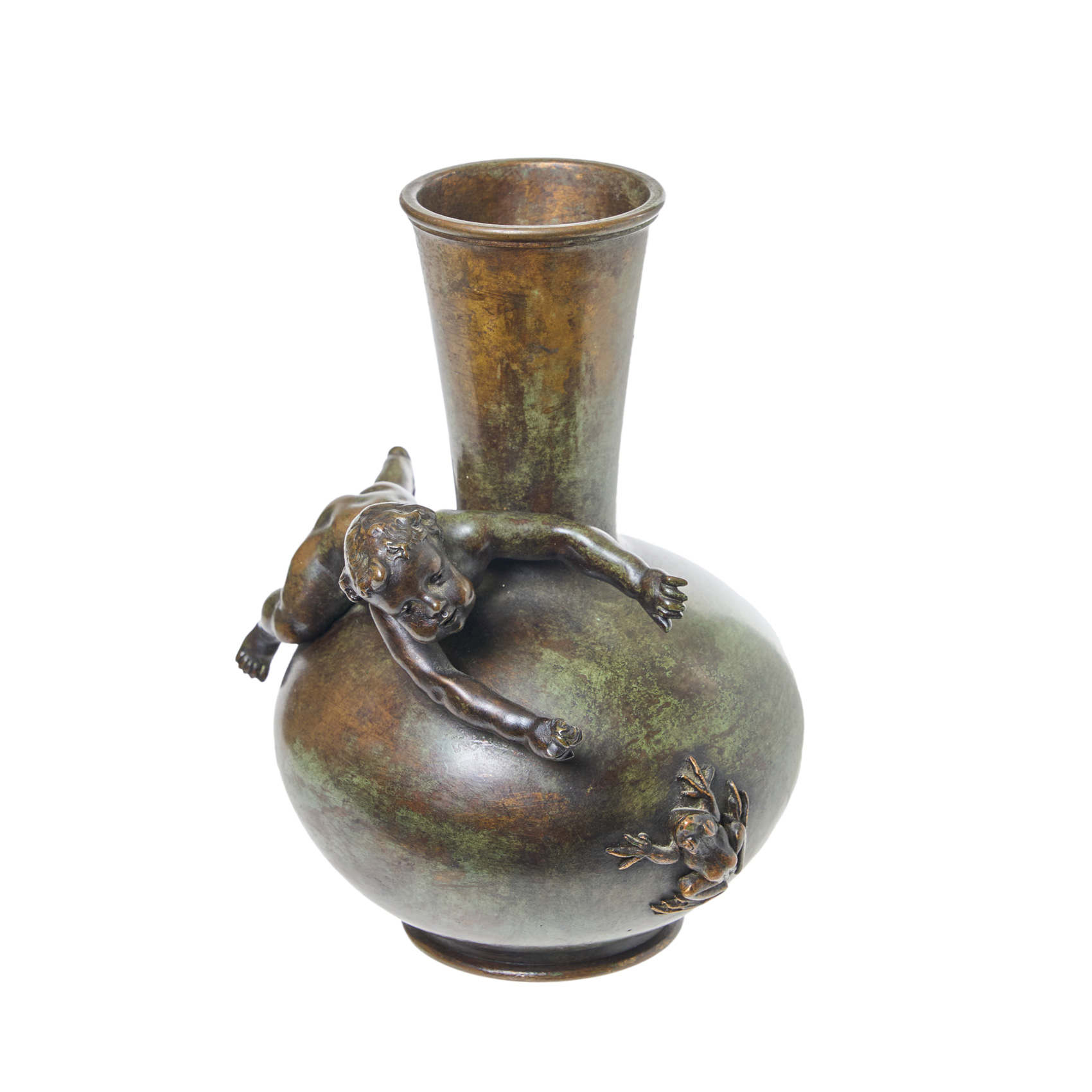 Jarrón Art Deco en bronce patinado con representación de figura de amorcillo cazando una rana en bulto redondo, ppios. del s.XX.