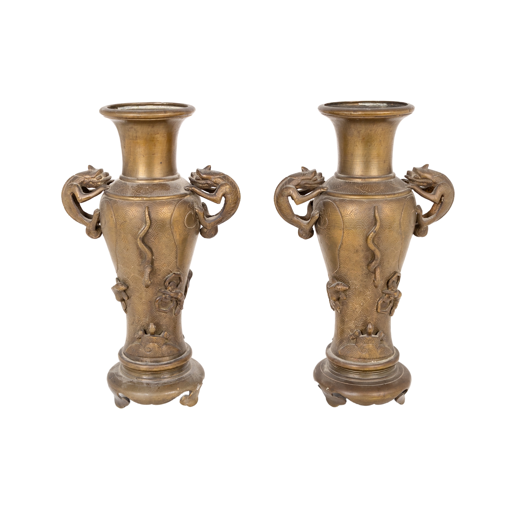 Pareja de jarrones chinos en bronce patinado con decoraciones animalísticas, s.XX.