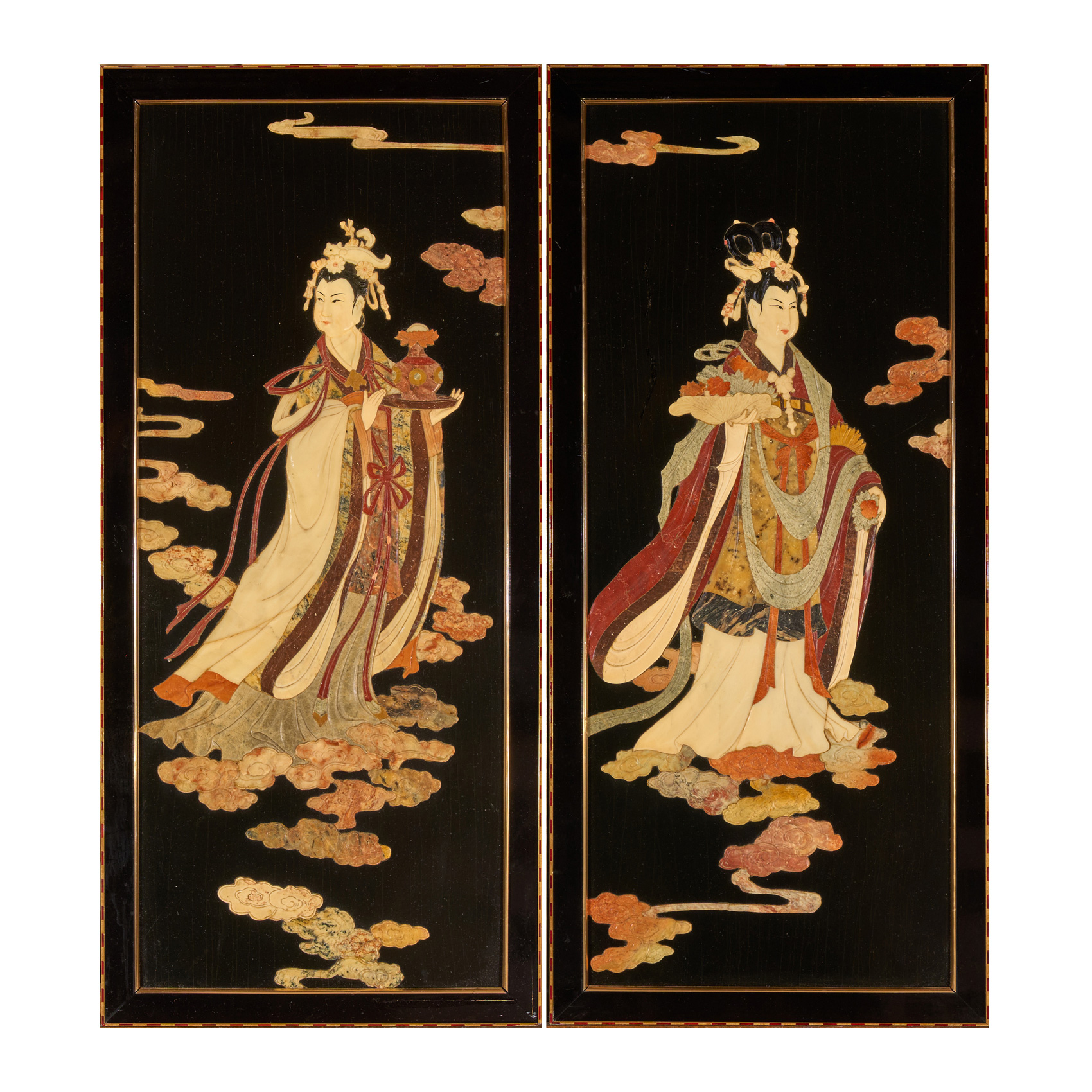 Pareja de plafones chinos en madera lacada con representación de personajes femeninos incrustados en hueso y piedras duras talladas, s.XX.
