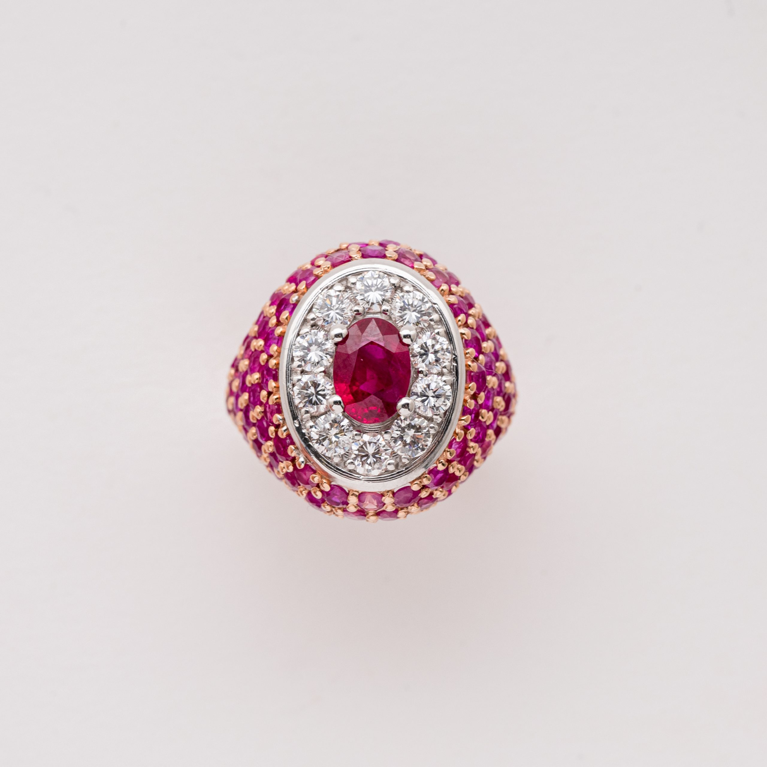 Sortija sello en oro rosa y blanco con cuerpo cuajado de rubíes talla redonda y rosetón central con rubí talla oval orlado por diamantes talla brillante.