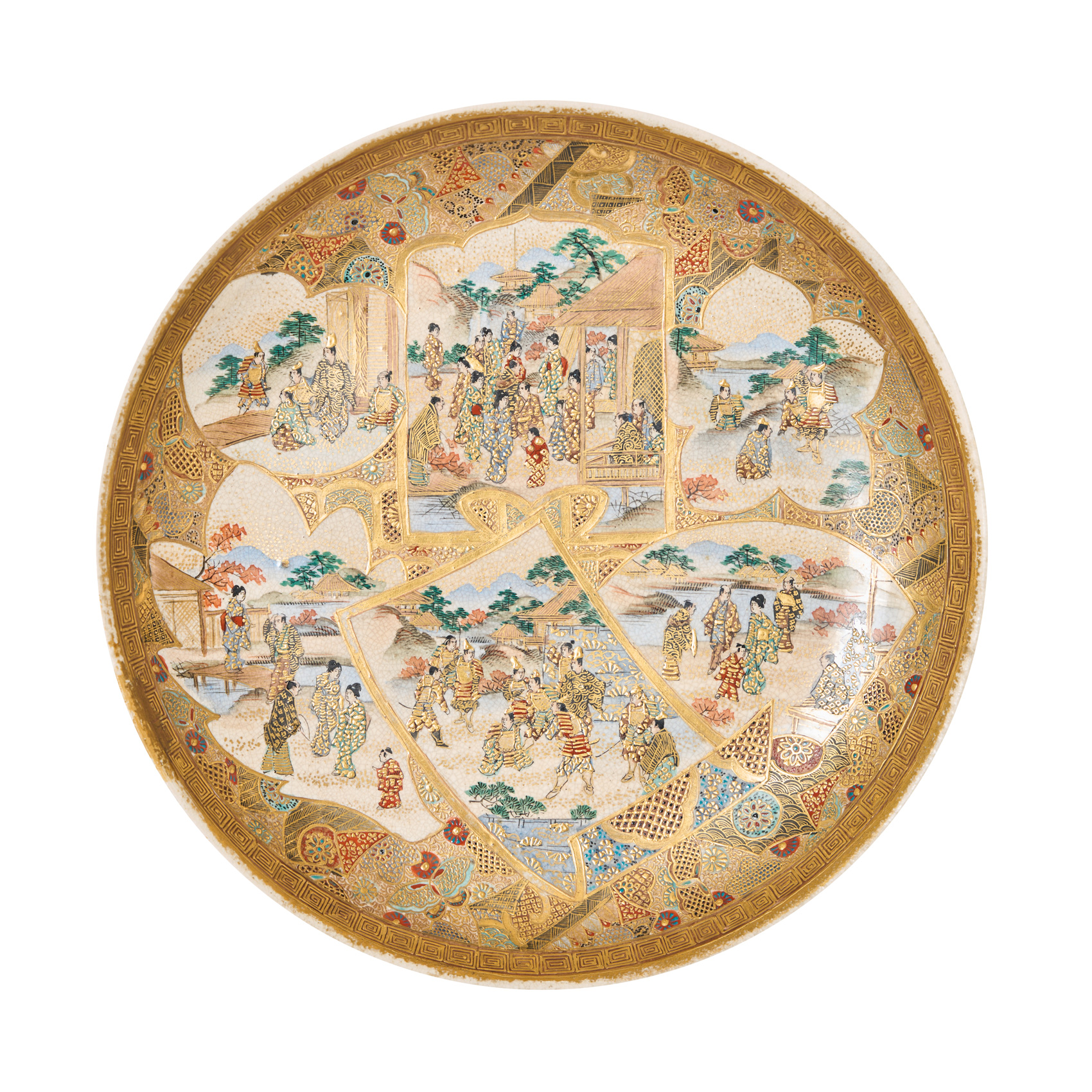 Plato japonés de estilo Meiji en cerámica esmaltada con decoraciones de escenas cortesanas y palaciegas en cartelas, primera mitad del s.XX. Marcas en la base.
