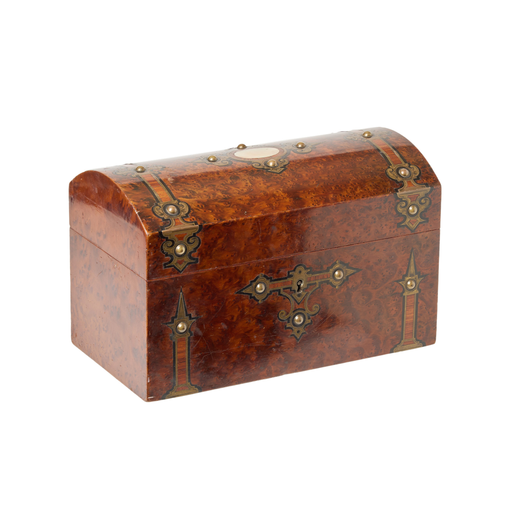 Caja inglesa victoriana en madera tallada con marquetería en latón dorado y pequeña placa de madreperla en la tapa, fles. del s.XIX. Adjunta llave.