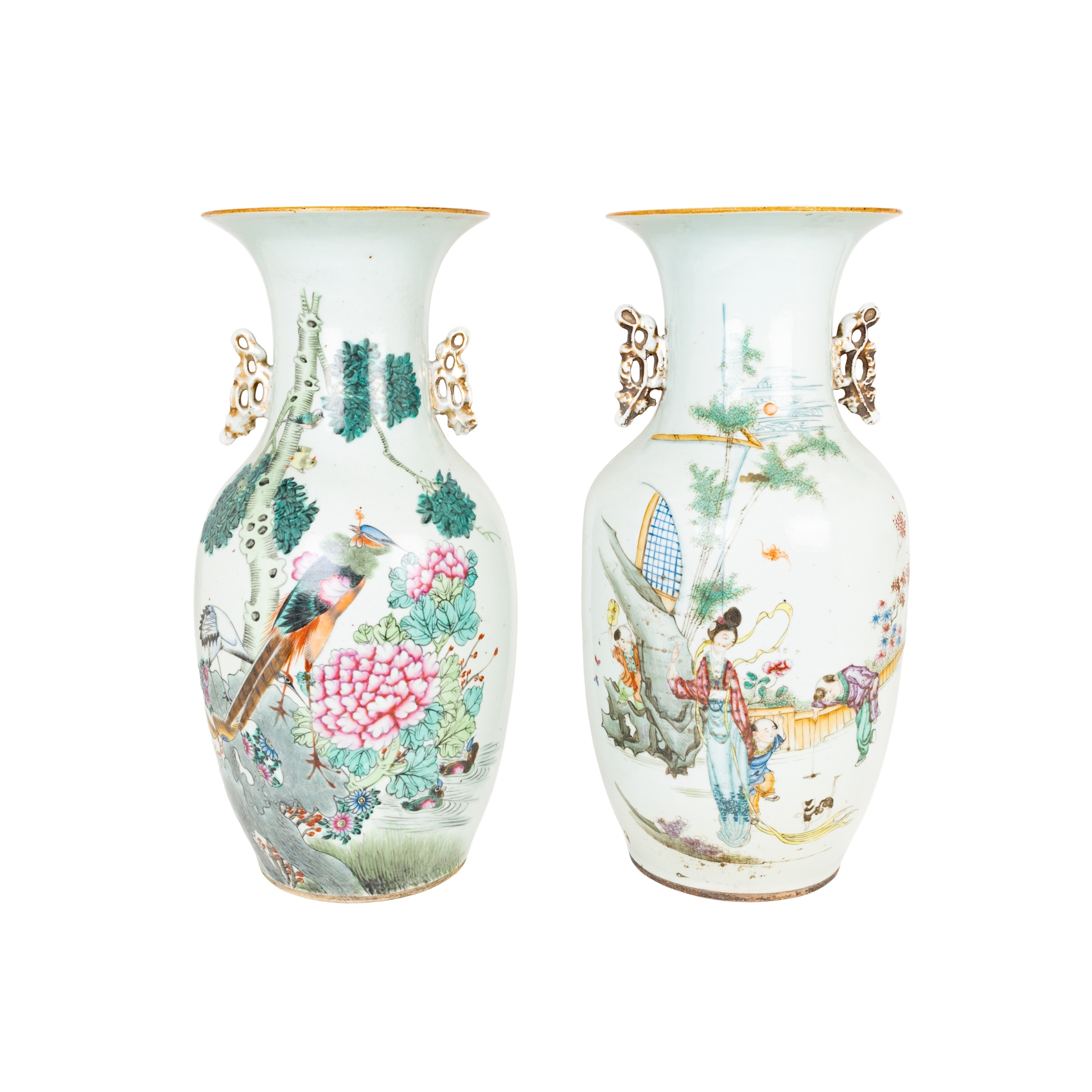 Pareja de jarrones chinos en porcelana esmaltada con decoración de motivos animalísticos, cortesanos y de caracteres, c.1920-1930.
