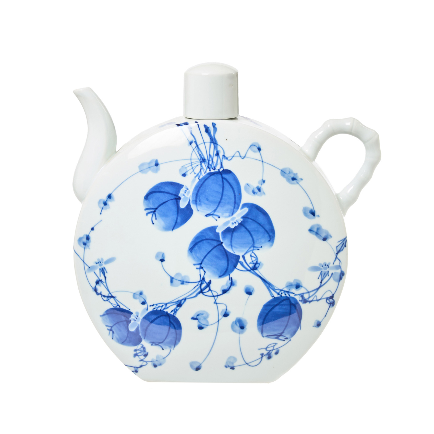 Tetera decorativa en porcelana china azul y blanca con decoración de frutos, segunda mitad del s.XX.