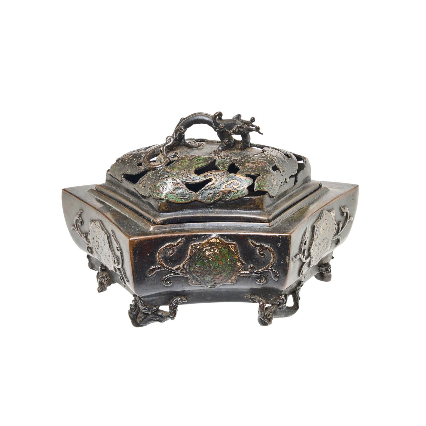 Incensiario chino en bronce patinado con decoracines de medallones esmaltados y tapa calada coronada por dragón, s.XX.