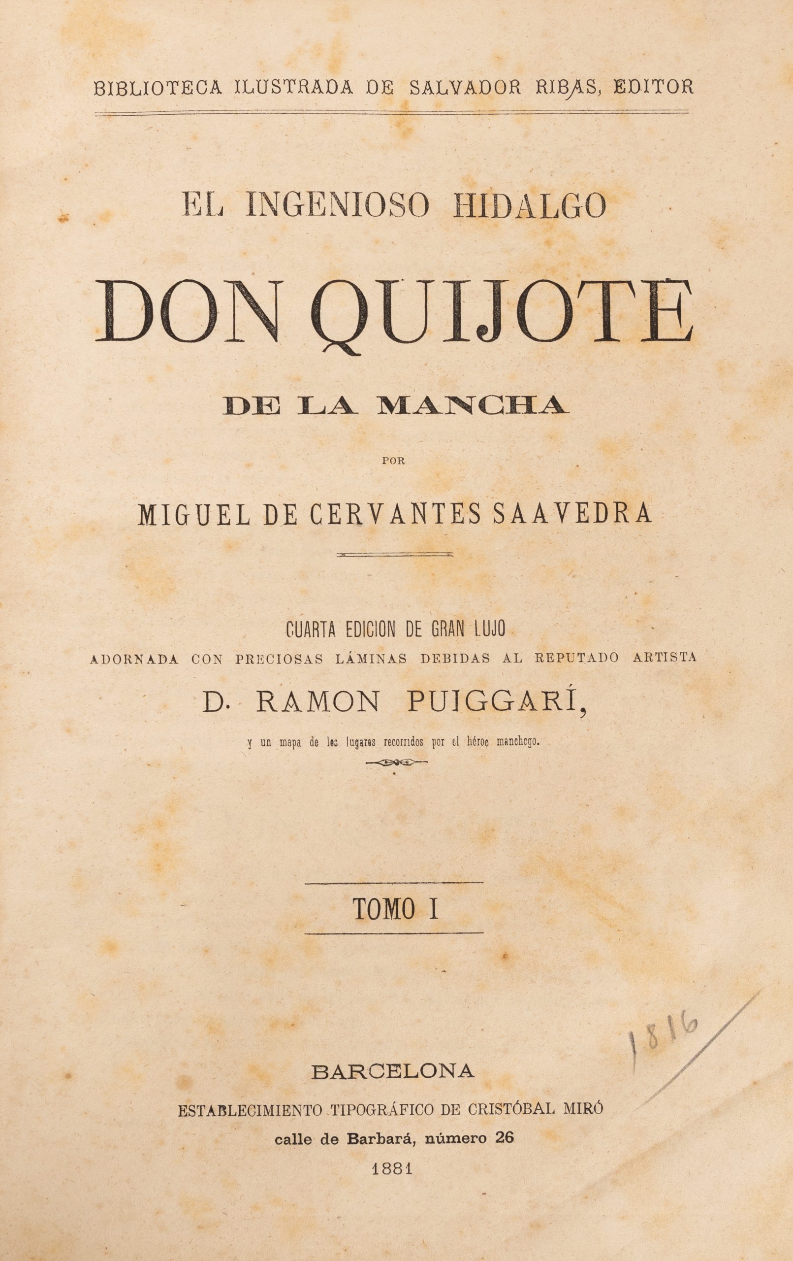 El ingenioso hidalgo Don Quijote de La Mancha. Dos tomos encuadernados en un solo volúmen de la obra de Miguel de Cervantes Saavedra (Alcalá de Henares, 1547-Madrid, 1616). Edición ilustrada con láminas de D. Ramon Puiggarí. Editado por Establecimiento Tipográfico de Cristóbal Miró, Barcelona, 1881.