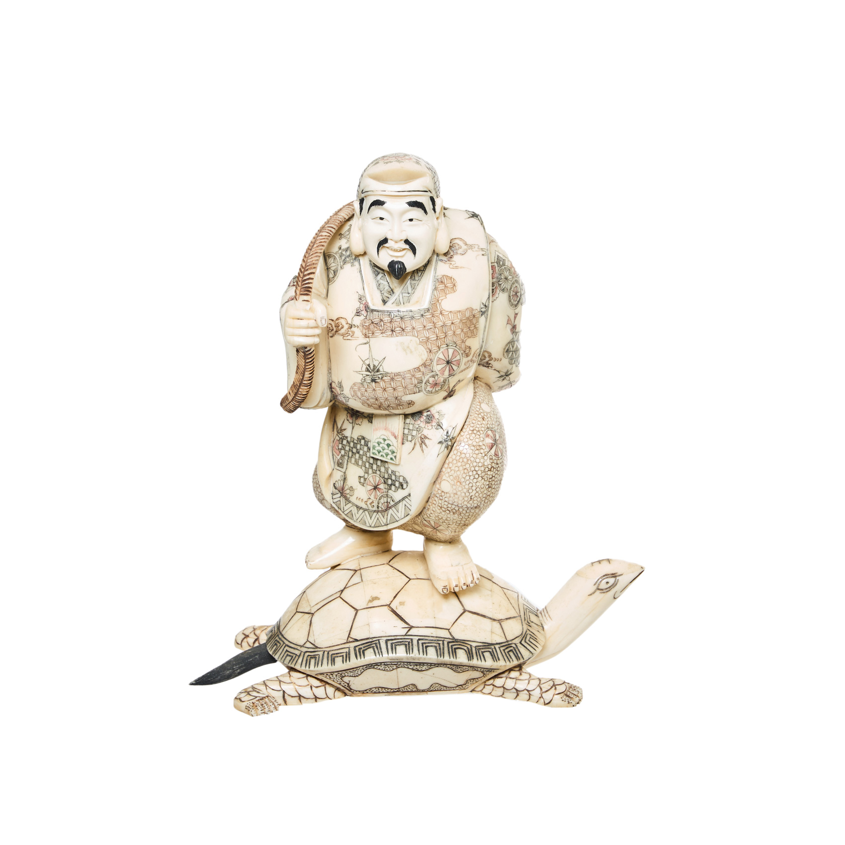 Pescador sobre tortuga. Figura china en hueso tallado con diversos motivos pintados a plumilla, ppios. del s.XX.