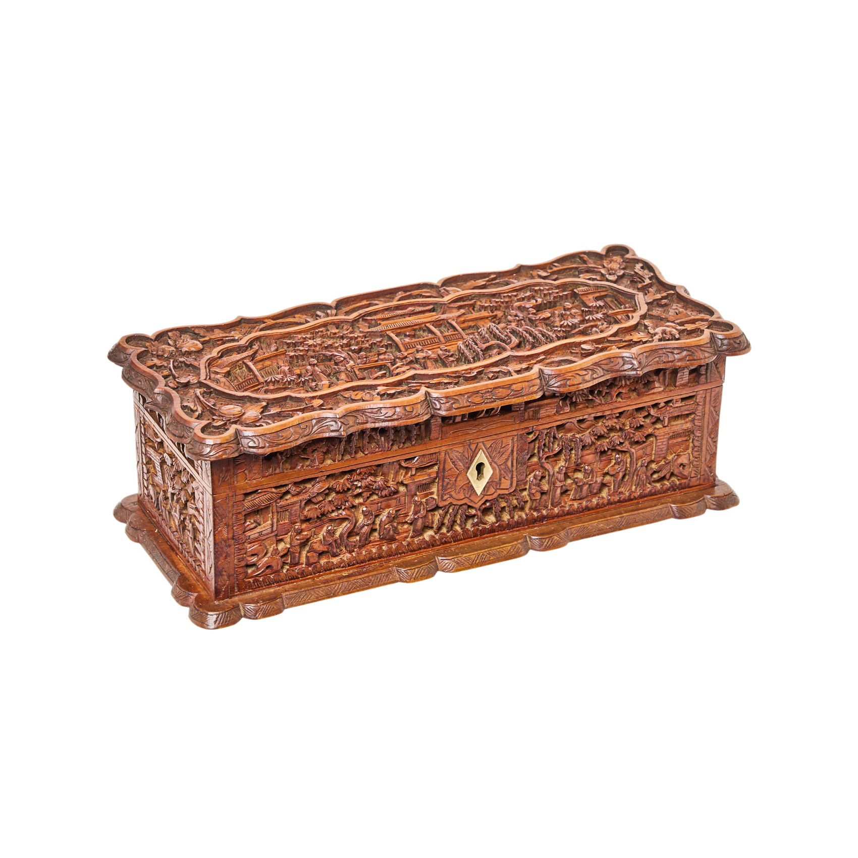 Caja china en madera de sándalo tallada con profusa decoración de las mil caras en bajorrelieve, s.XX. Adjunta llave.