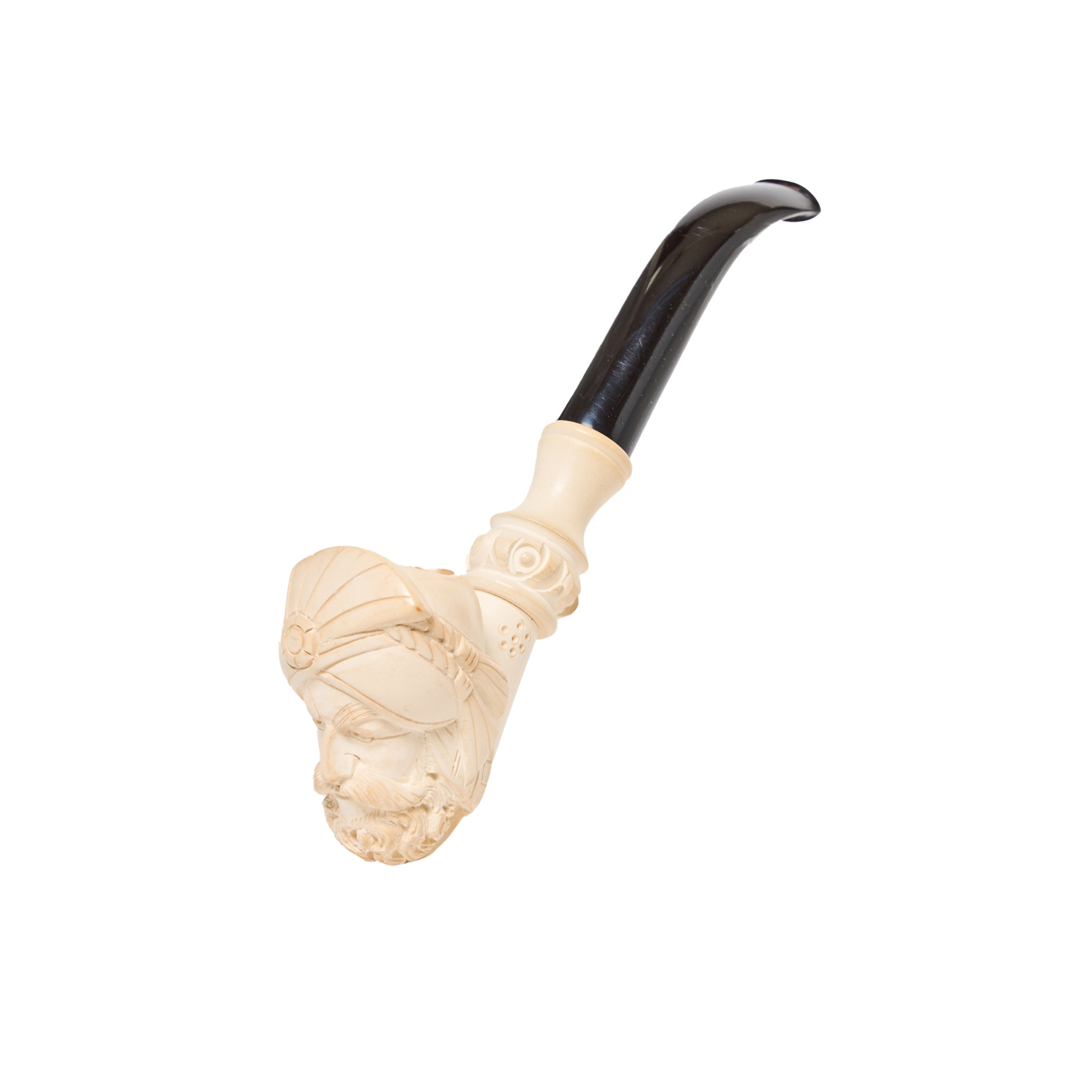 Pipa turca de espuma de mar con decoración tallada en relieve de cabeza, s.XX. Adjunta estuche original.