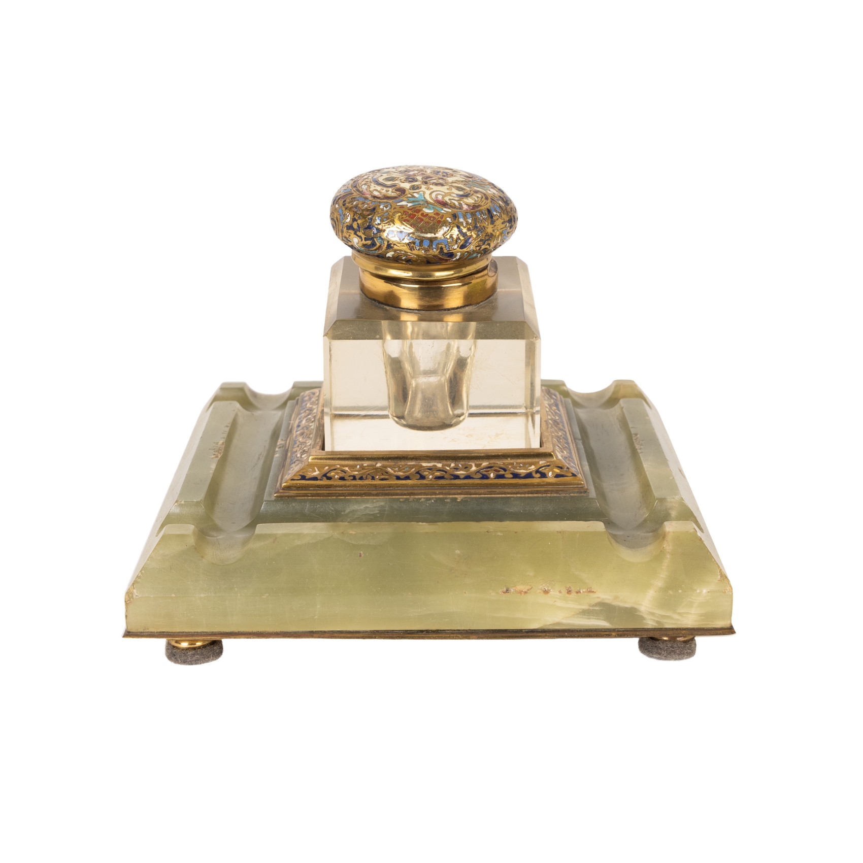 Tintero de sobremesa en onix verde con decoración en metal dorado policromado, s.XX.