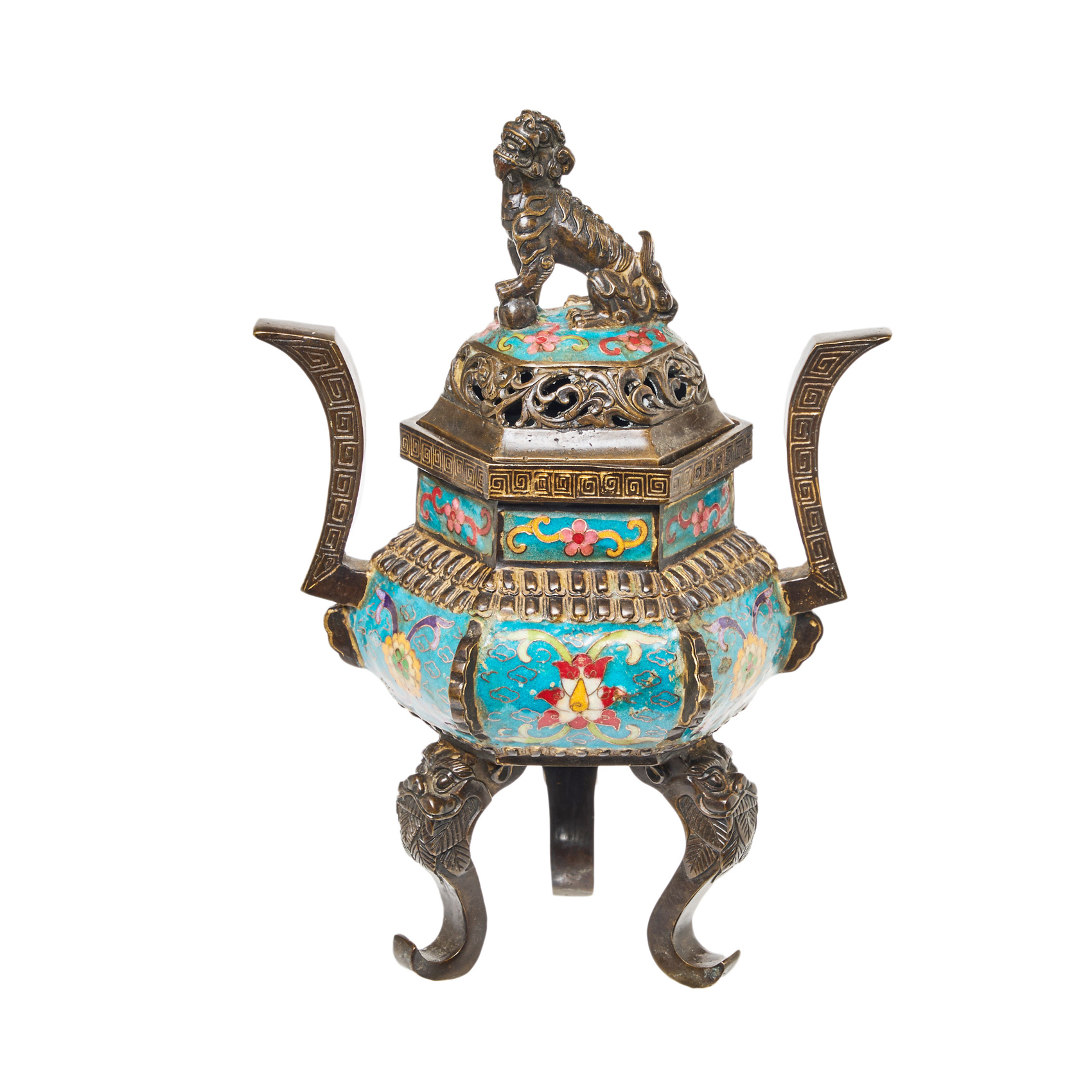 Incensiario chino en bronce patinado y esmalte champlevé con decoracines florales y de mascarones y tapa calada coronada por León de Foo, mediados del s.XX.