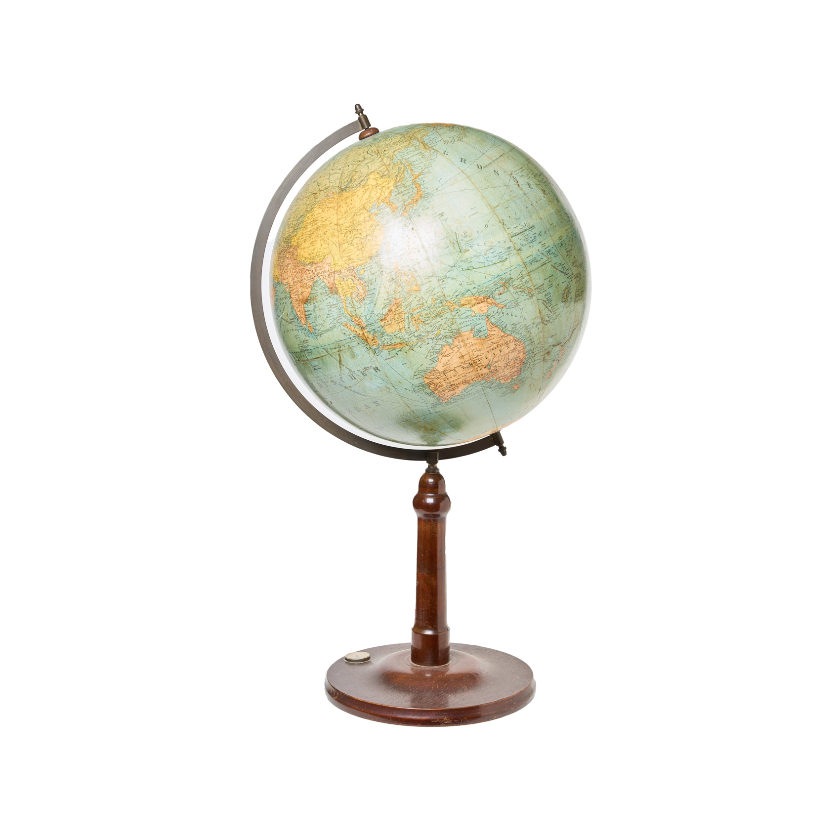 Globo terráqueo alemán de la manufactura Wagner & Debes Erd-Globus, Leipzig, sobre pie en madera tallada con brújula, ppios. del s.XX.